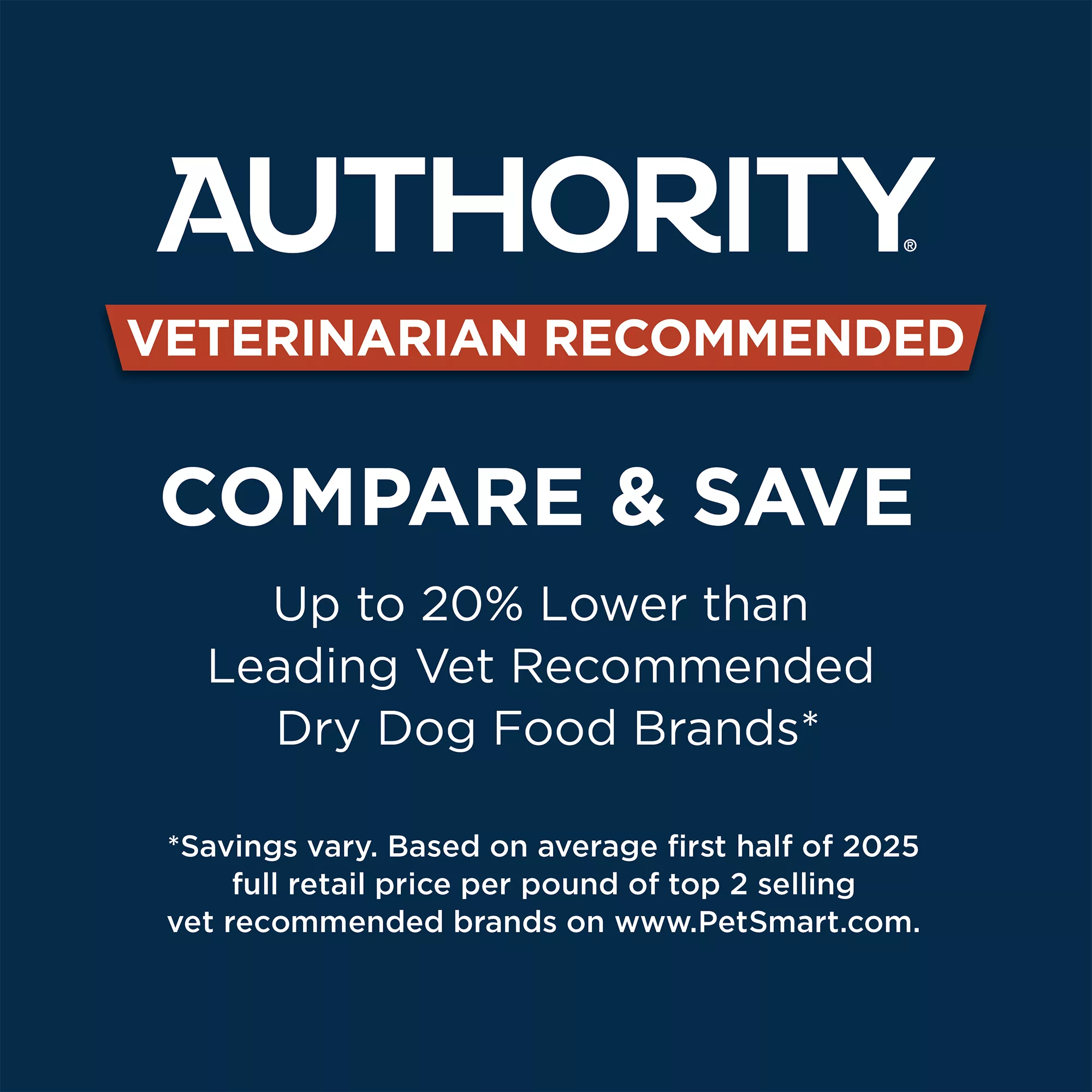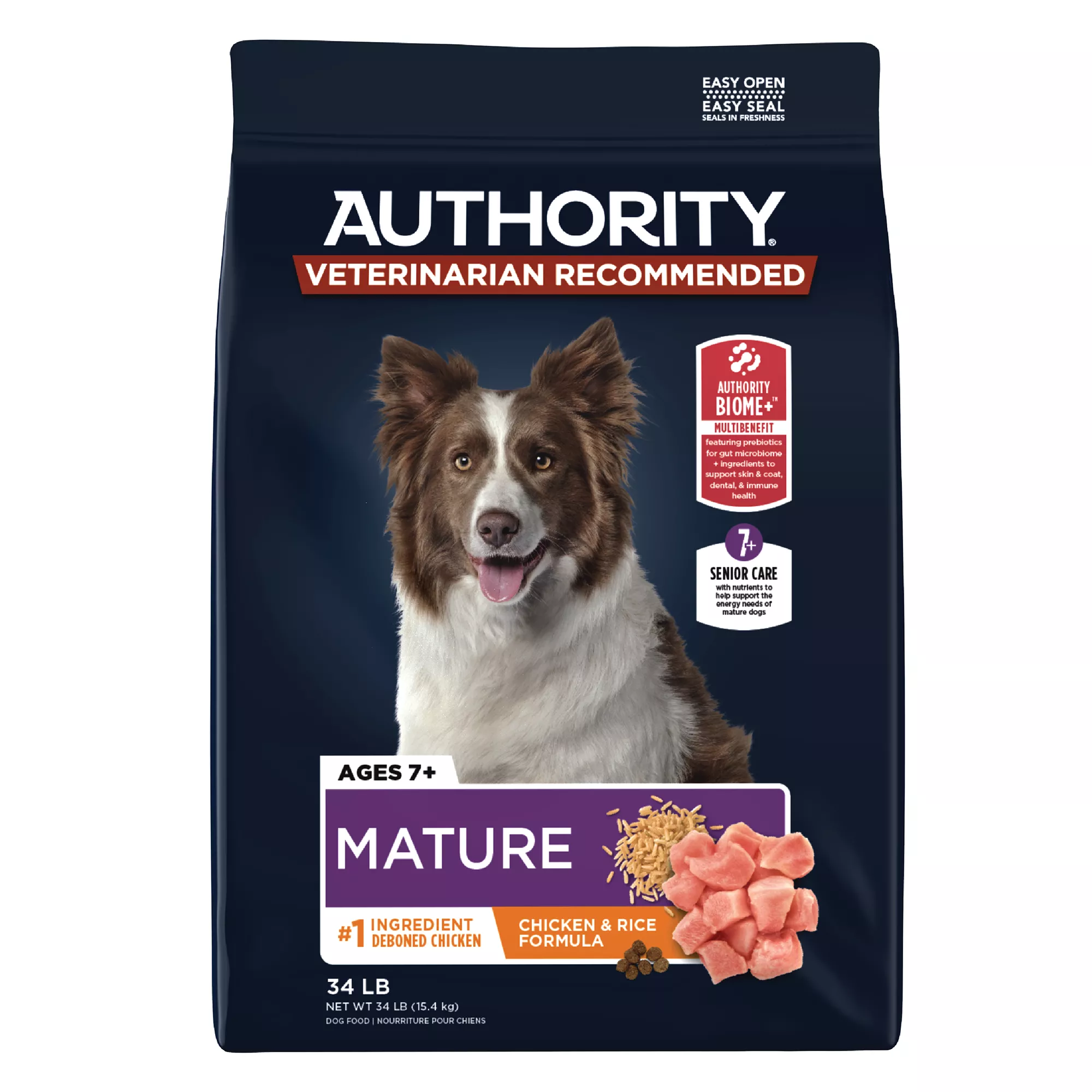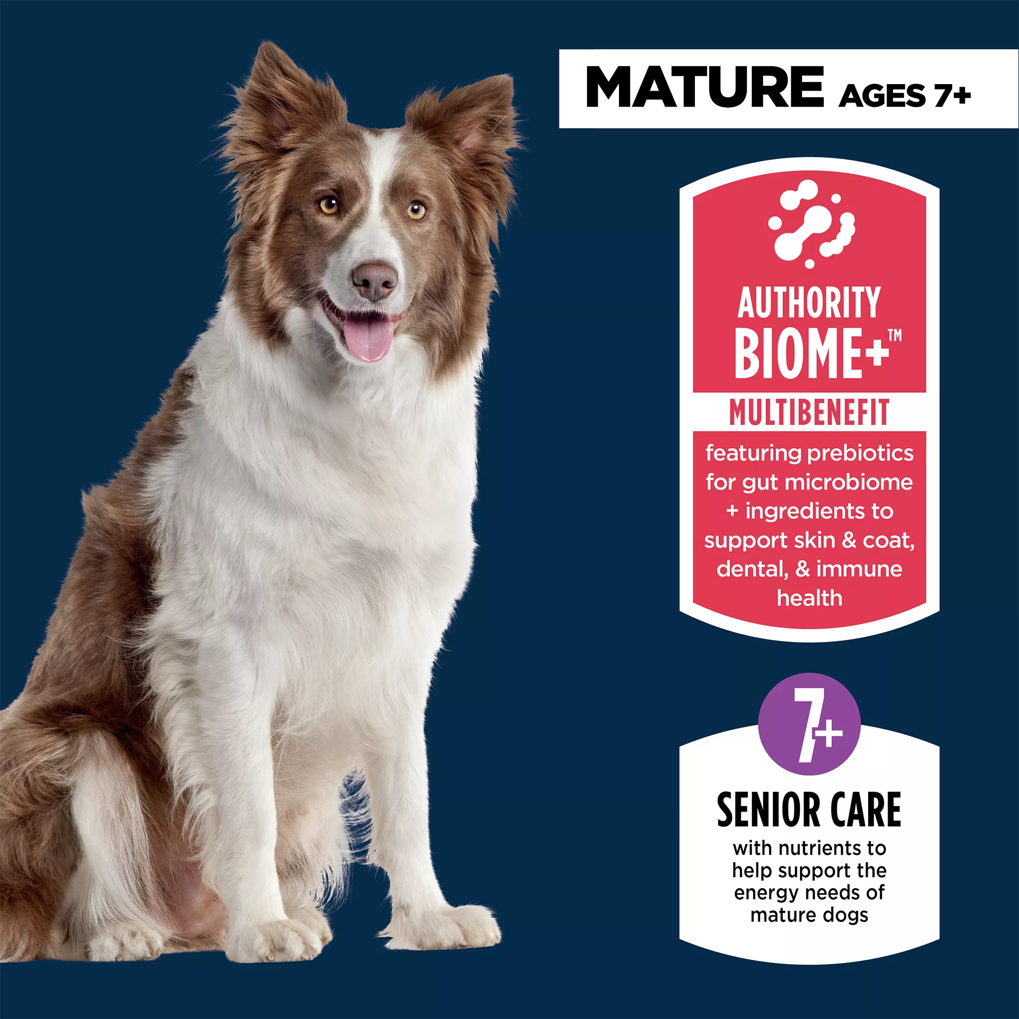Authority? veterinarian recommended products reflect decades of research and experience, all aimed at delivering next-level nutrition. Which is key, because we believe that’s the foundation for a healthy, active, rewarding life for your pet. Provide your dog with a delicious and nutritious mealtime choice by serving Authority? Chicken & Rice Formula Mature Adult Dog Food. This formula features the Authority Biome+? multibenefit blend of prebiotics for the gut microbiome, as well as ingredients that support skin & coat, dental, and immune health. Exclusively at PetSmart.