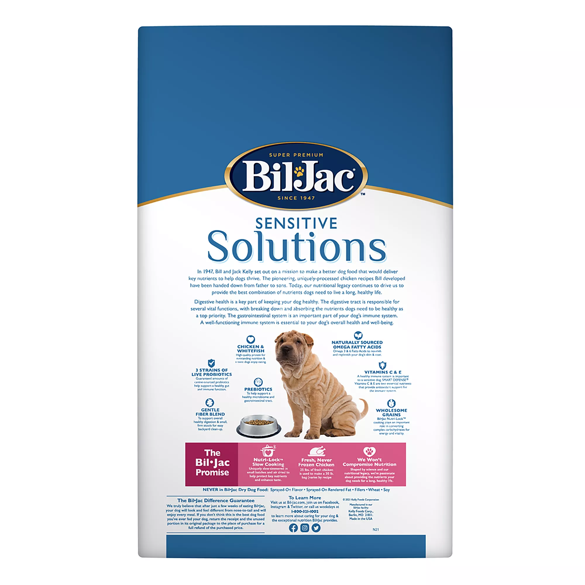 When you have a highly sensitive dog, they can often benefit from advanced nutrition. Since the heath of a dog’s gut and immune system are linked, Bil-Jac takes a whole body approach in offering a food specifically made to support both and keep the most sensitive dogs happy and healthy. Bil-Jac Sensitive Solutions Digestive & Immune Support dry dog food is made with real chicken and whitefish for sensitive stomachs. A combination of prebiotics, probiotics and fiber is used to support digestive health and your dog’s microbiome. SMART DEFENSE adds antioxidant nutrients Vitamins C & E to help support immune function. Bil-Jac Sensitive Solutions Digestive & Immune Support dry dog food is specially formulated with complete and balanced nutrition for sensitive puppy, adult, and senior dogs of all breed sizes.
