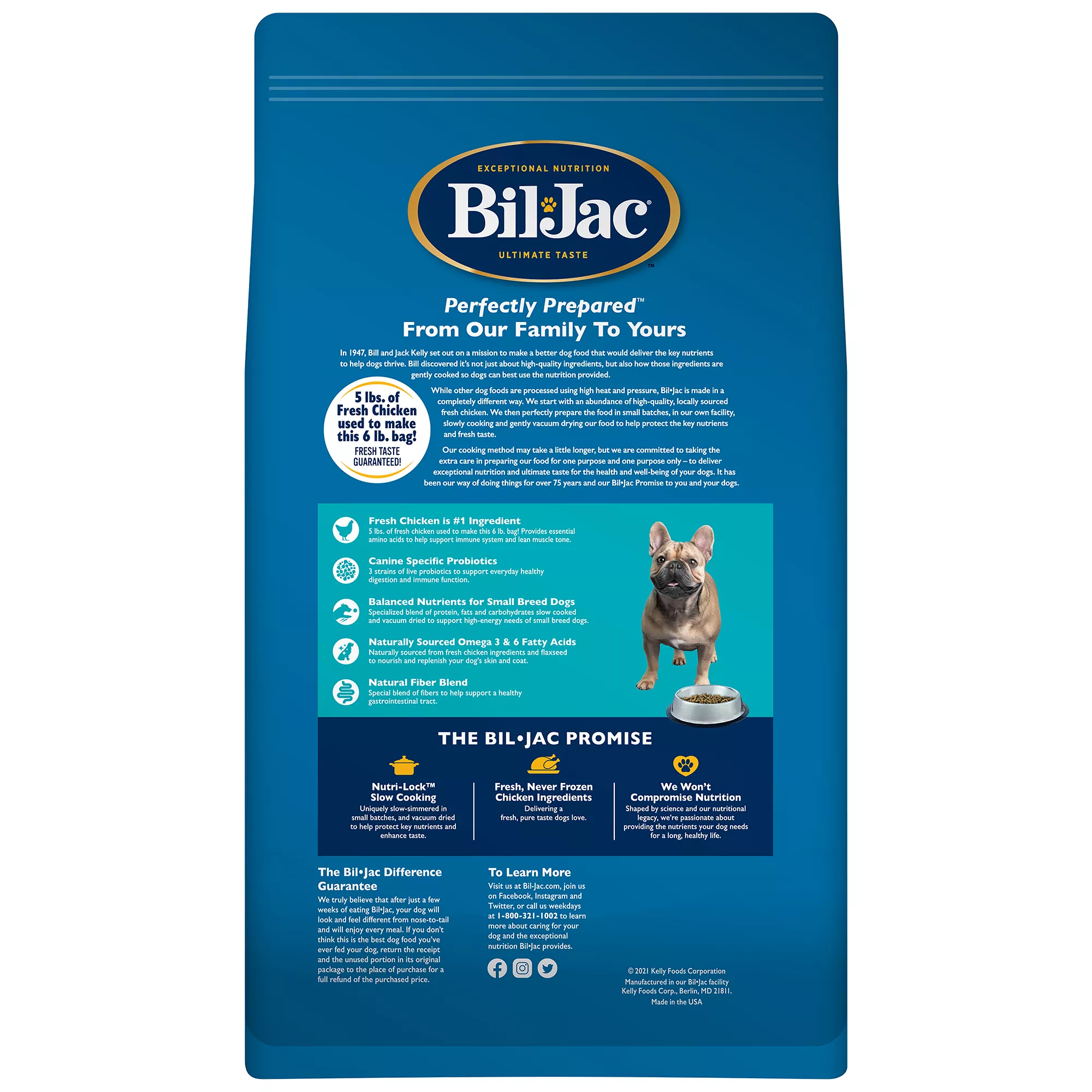 Your small breed dog deserves a food that provides exceptional nutrition and ultimate taste. Bil-Jac Small Breed Adult dry dog food features a specialized blend of protein, fat, oatmeal, and yams to help support the energy needs of small breed dogs. Fresh, locally sourced chicken is the #1 ingredient to help provide high-quality protein and support lean muscle tone. The unique way this dry food is made allows for 25 lbs. of fresh chicken to be used to make each 30 lb. bag. Since Bil-Jac is made without high pressure and is gently dried, the food pieces are easy to chew for small mouths and jaws. Bil-Jac Small Breed Adult dry dog food also has naturally sourced Omega 3 & 6 Fatty Acids to nourish skin and coat. Canine-specific probiotics help support your dog&339;s healthy digestion and make backyard clean-up small and easy. Treat your four-legged family member to a complete and balanced meal specifically for fully-grown, small breed dogs and a taste they willlove to eat.