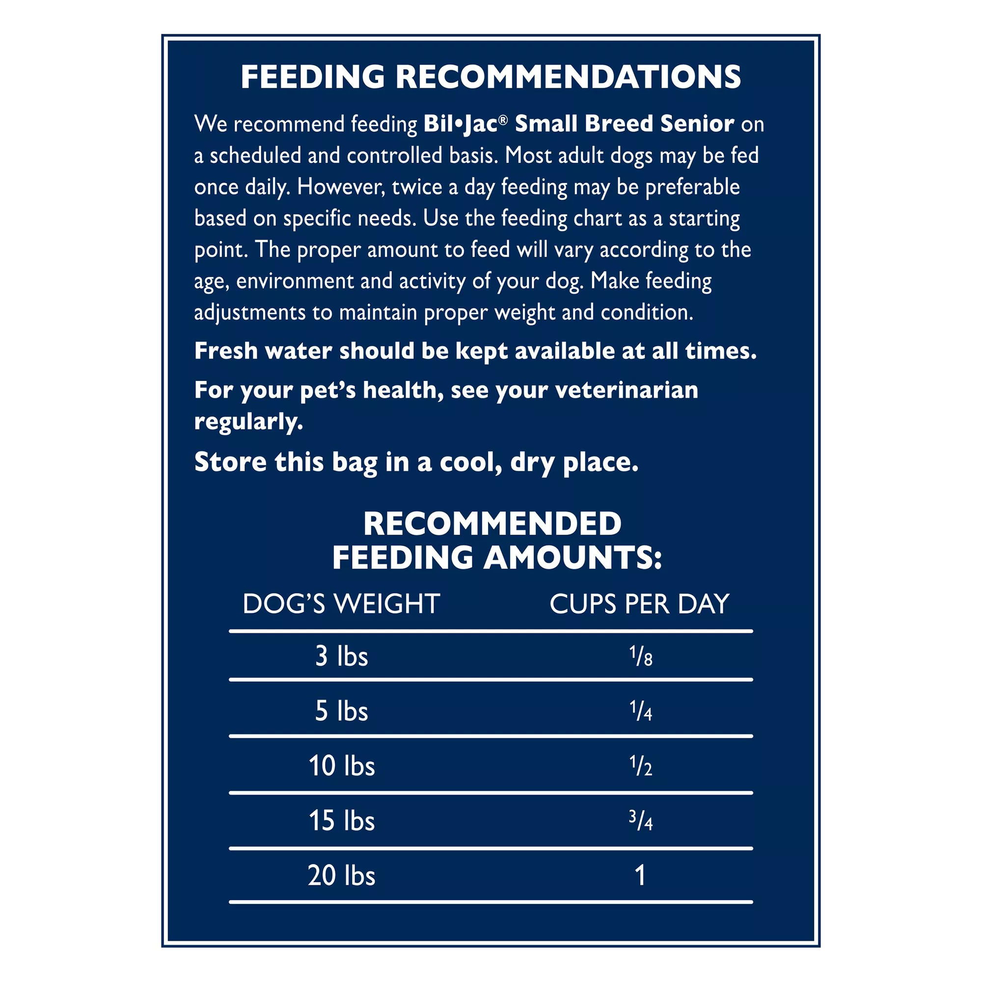Help your small breed senior dog stay active with the exceptional nutrition of Bil-Jac Small Breed Senior dry dog food. Formulated with controlled levels of fat and protein to help provide the energy your senior dog needs each day. Slow cooked and gently dried, this cooking method maintains essential amino acids for lean muscle support and will give your mature dog a taste they will crave. Delicious, easy to chew bites are helpful for older dogs with teeth or jaw concerns. A specialized blend of gentle fibers helps support a healthy gastrointestinal tract and small, firm stools, making backyard clean up a breeze. Canine-specific probiotics help support everyday healthy digestion and the immune system for overall health. Naturally sourced Omega 3 & 6 Fatty Acids help to support a beautiful show-ring coat. Keep your small breed senior happy and healthy with complete and balanced nutrition specifically for small breed dogs 7 years or older.