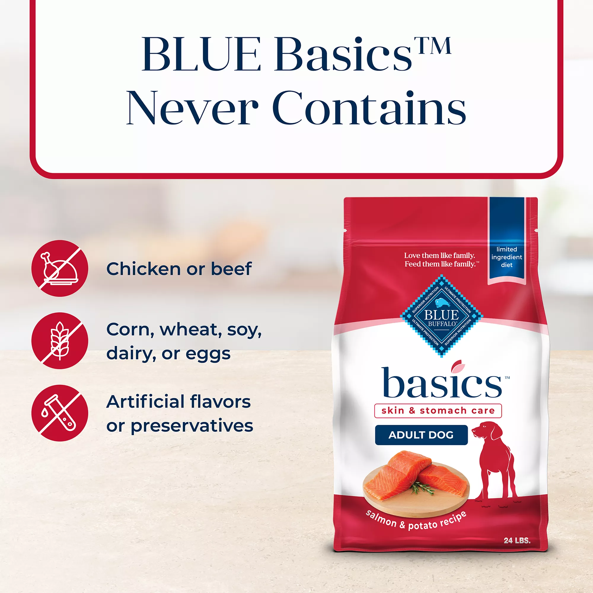 Contains: One (1) 24-lb. bag of BLUE Basics Skin & Stomach Care Adult Dry Dog Food, Salmon & Potato Recipe