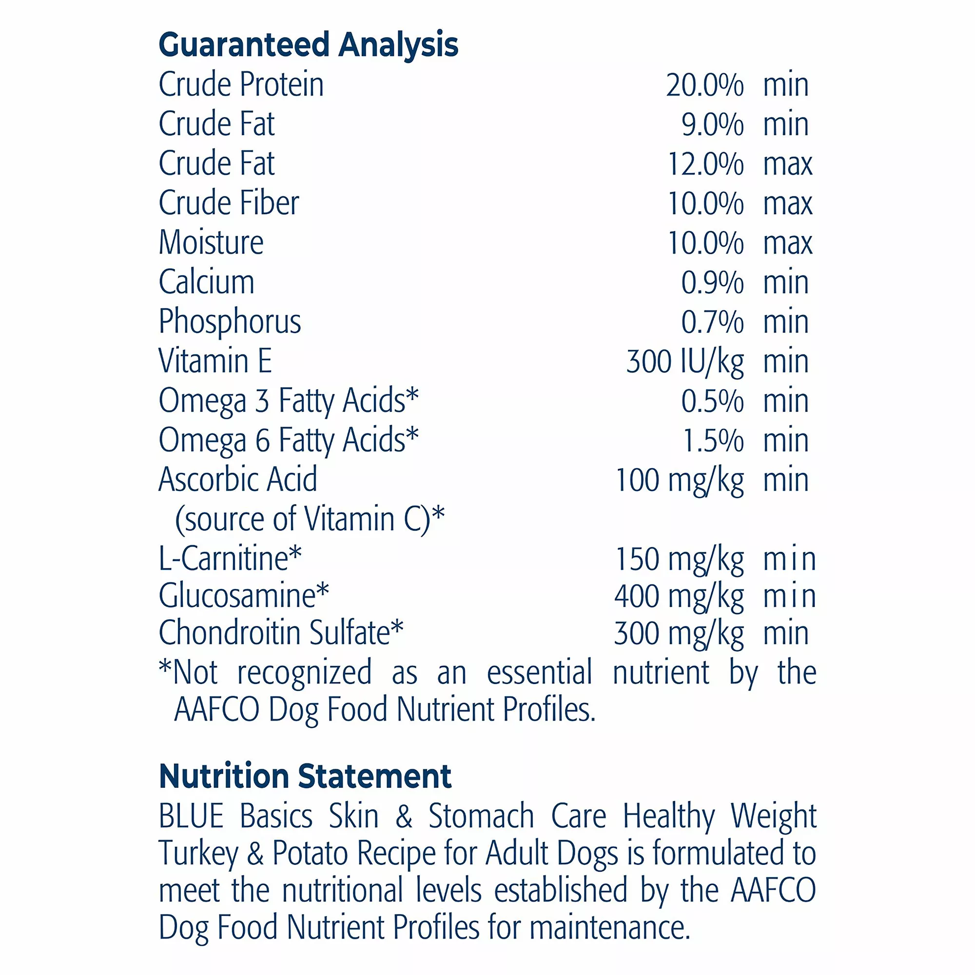 BLUE Basics Healthy Weight Turkey & Potato Recipe is a limited-ingredient diet formulated to minimize food sensitivities some dogs experience, while maximizing the nutritional value they receive. And because it’s BLUE, it???s made with only the finest natural ingredients: