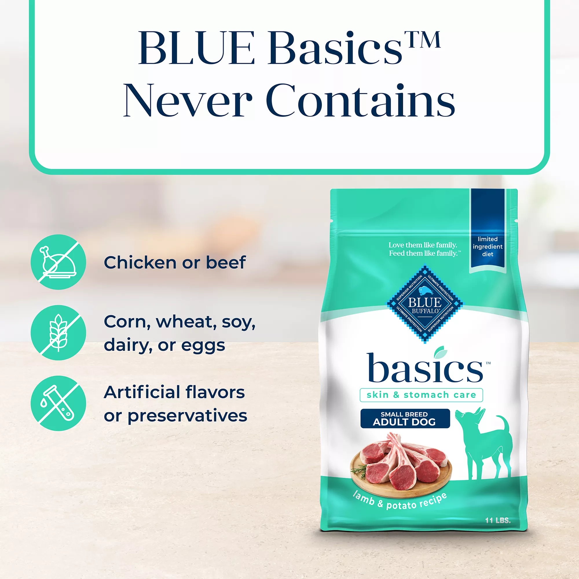 Contains: One (1) 11-lb. bag of BLUE Basics Skin & Stomach Care Small Breed Adult Grain-Free Dry Dog Food, Lamb & Potato Recipe