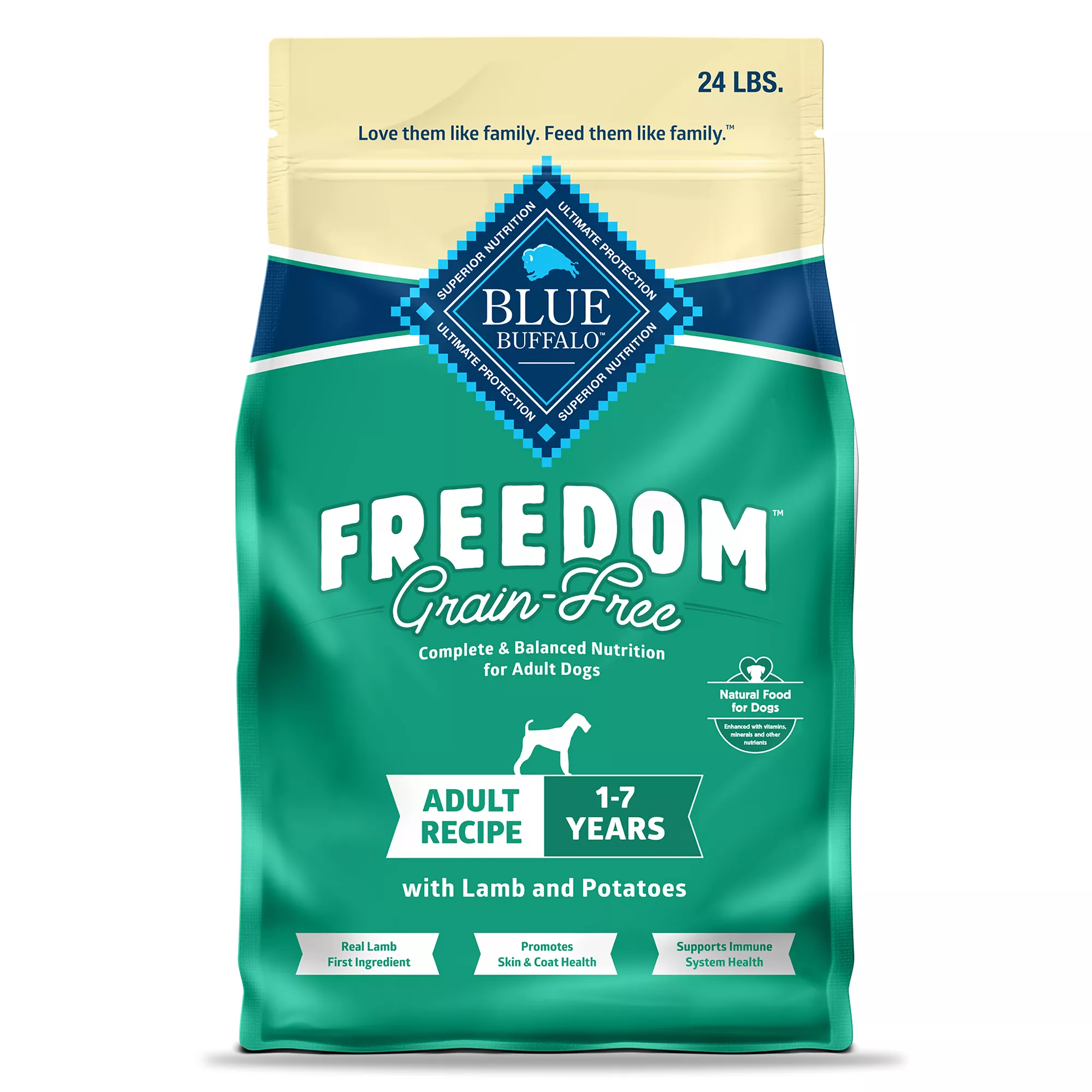 Contains: One (1) 24-lb bag of BLUE Freedom Grain-Free Dry