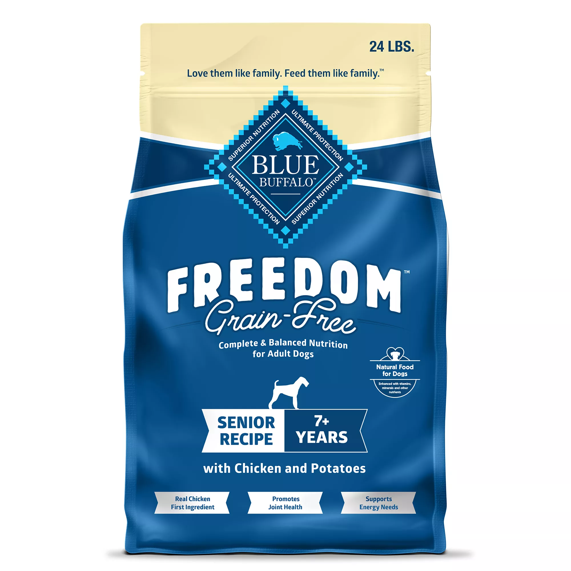 Contains: One (1) 24-lb bag of BLUE Freedom Grain-Free Senior Dry Dog Food, Chicken Recipe