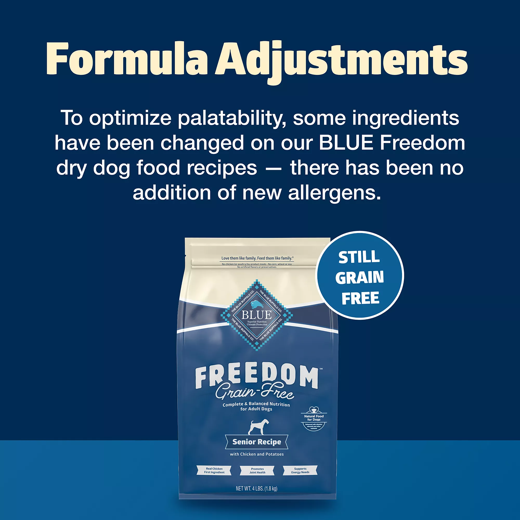 FORMULA ADJUSTMENTS: To optimize palatability, ingredients have been changed on our BLUE Freedom Dog Dry recipes
