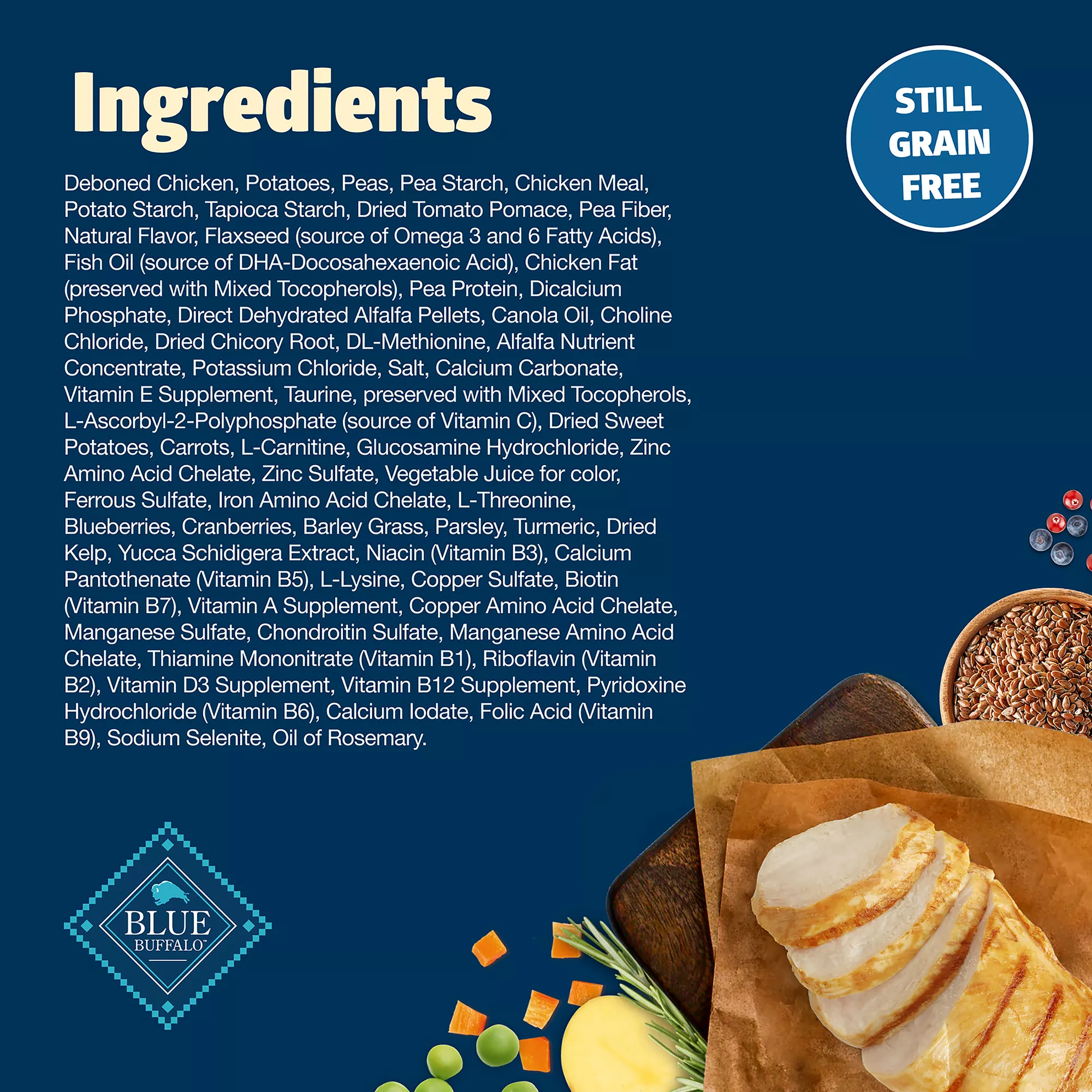 L-Threonine, Blueberries, Cranberries, Barley Grass, Parsley, Turmeric, Dried Kelp, Yucca Schidigera Extract, Niacin (Vitamin B3), Calcium Pantothenate (Vitamin B5), L-Lysine, Copper Sulfate, Biotin (Vitamin B7), Vitamin A Supplement, Copper Amino Acid Chelate, Manganese Sulfate, Chondroitin Sulfate, Manganese Amino Acid Chelate, Thiamine Mononitrate (Vitamin B1), Riboflavin (Vitamin B2), Vitamin D3 Supplement, Vitamin B12 Supplement, Pyridoxine Hydrochloride (Vitamin B6), Calcium Iodate, Folic Acid (Vitamin B9), Sodium Selenite, Oil of Rosemary.