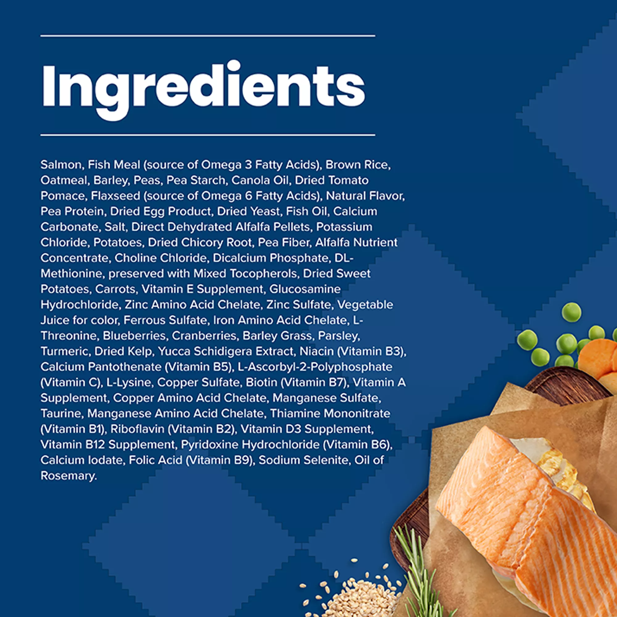 Ingredients: Salmon, Fish Meal (source of Omega 3 Fatty Acids), Brown Rice, Oatmeal, Barley, Peas, Pea Starch, Canola Oil, Dried Tomato Pomace, Flaxseed (source of Omega 6 Fatty Acids), Natural Flavor, Pea Protein, Dried Egg Product, Dried Yeast, Fish Oil, Calcium Carbonate, Salt, Direct Dehydrated Alfalfa Pellets, Potassium Chloride, Potatoes, Dried Chicory Root, Pea Fiber, Alfalfa Nutrient Concentrate, Choline Chloride, Dicalcium Phosphate, DL?Methionine, preserved with Mixed Tocopherols, Dried Sweet Potatoes, Carrots, Vitamin E Supplement, Glucosamine Hydrochloride, Zinc Amino Acid Chelate, Zinc Sulfate, Vegetable Juice for color, Ferrous Sulfate, Iron Amino Acid Chelate, L?Threonine, Blueberries, Cranberries, Barley Grass, Parsley, Turmeric, Dried Kelp, Yucca Schidigera Extract, Niacin (Vitamin B3), Calcium Pantothenate (Vitamin B5), L?Ascorbyl?2?Polyphosphate (Vitamin C), L?Lysine, Copper Sulfate, Biotin (Vitamin B7), Vitamin A Supplement, Copper Amino Acid Chelate, Manganese Sulfate, Taurine, Manganese Amino Acid Chelate, Thiamine Mononitrate (Vitamin B1), Riboflavin (Vitamin B2), Vitamin D3 Supplement, Vitamin B12 Supplement, Pyridoxine Hydrochloride (Vitamin B6), Calcium Iodate, Folic Acid (Vitamin B9