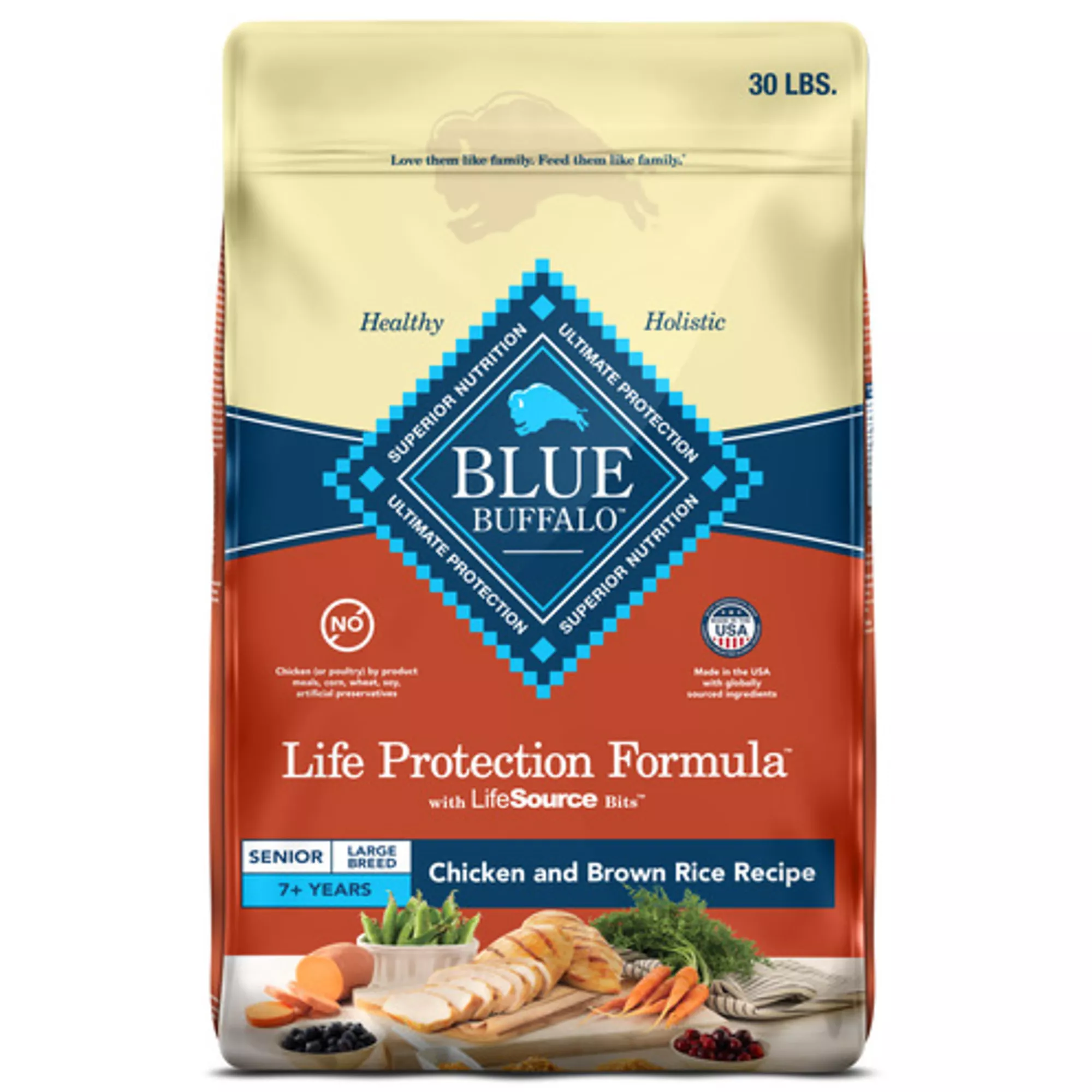 Contains: One (1) 30-lb. bag of BLUE Life Protection Formula Large Breed Senior Dry Dog Food, Chicken and Brown Rice Recipe