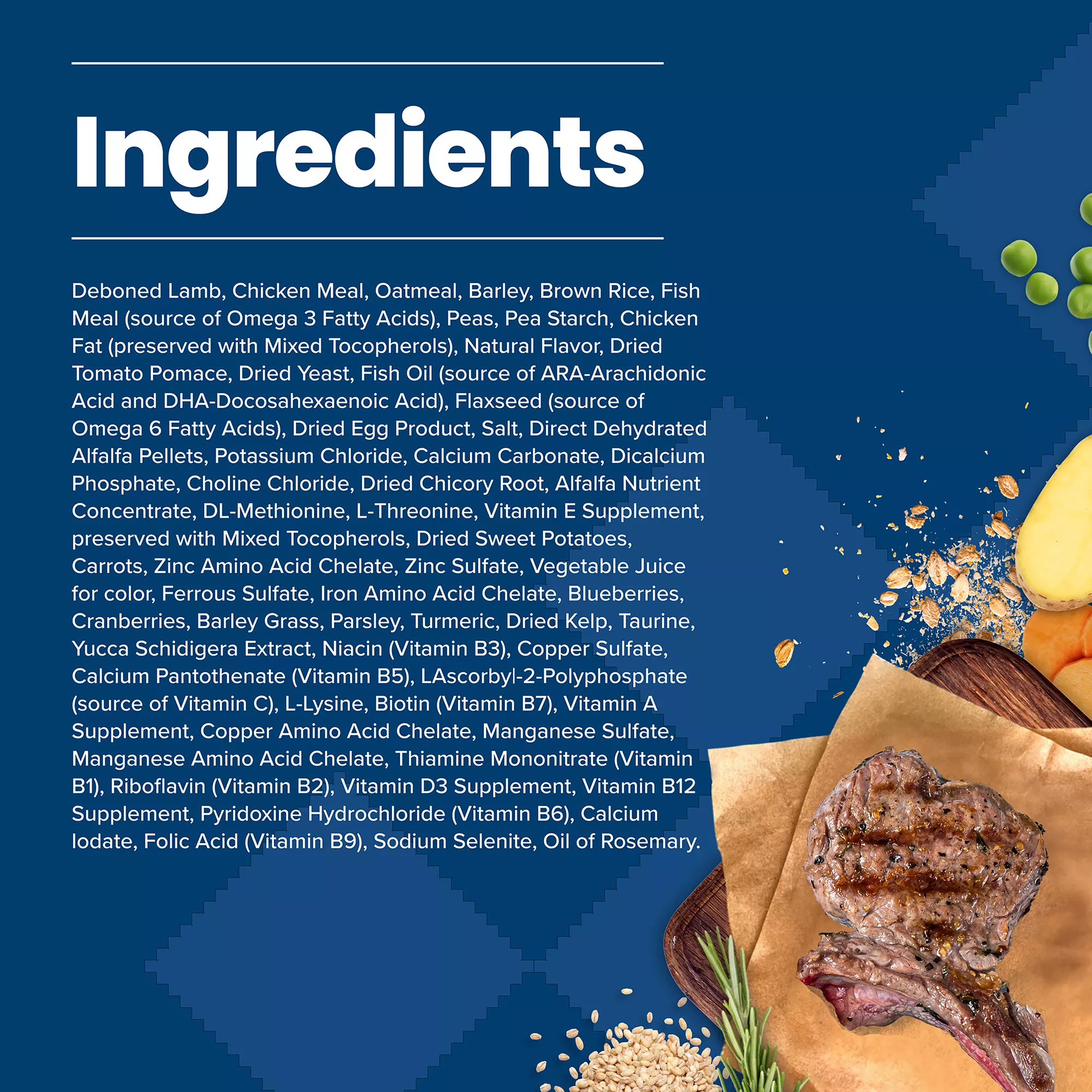 Ingredients: Deboned Lamb, Chicken Meal, Oatmeal, Barley, Brown Rice, Fish Meal (source of Omega 3 Fatty Acids), Peas, Pea Starch, Chicken Fat (preserved with Mixed Tocopherols), Natural Flavor, Dried Tomato Pomace,