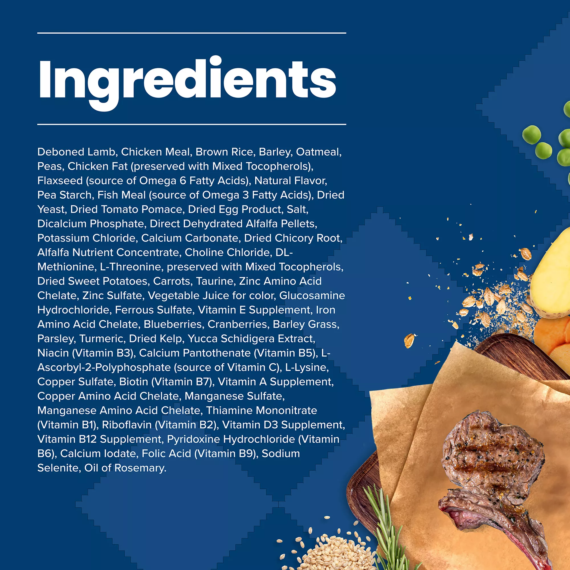 Ingredients: Deboned Lamb, Chicken Meal, Brown Rice, Barley, Oatmeal, Peas, Chicken Fat (preserved with Mixed Tocopherols), Flaxseed (source of Omega 6 Fatty Acids), Natural Flavor, Pea Starch, Fish Meal (source of Omega 3 Fatty Acids), Dried Yeast, Dried Tomato Pomace, Dried Egg Product, Salt, Dicalcium Phosphate, Direct Dehydrated Alfalfa Pellets, Potassium Chloride, Calcium Carbonate, Dried Chicory Root, Alfalfa Nutrient Concentrate, Choline