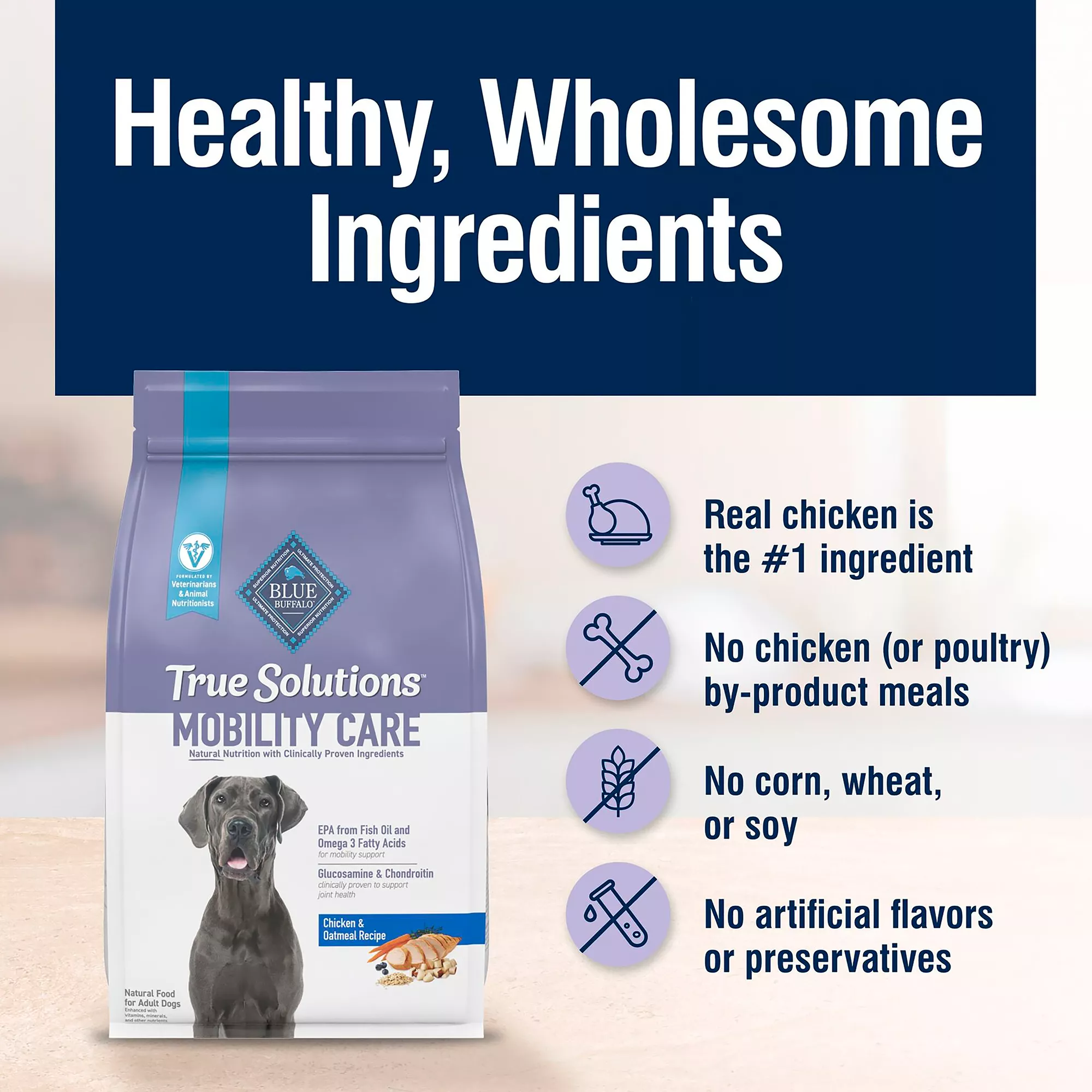 BLUE True Solutions Jolly Joints Dry Dog Food offers natural nutrition for mobility support. Made with real chicken as the #1 ingredient, this dry dog food for adult dogs features Glucosamine and Chondroitin, which are clinically proven to support joint health. It’s also made with EPA from fish oil and Omega 3 fatty acids to support mobility. Like all Blue Buffalo dog food recipes, BLUE True Solutions natural dog food is formulated without any chicken (or poultry) by-product meals. It is also free of corn, wheat, soy, artificial flavors, and preservatives.
