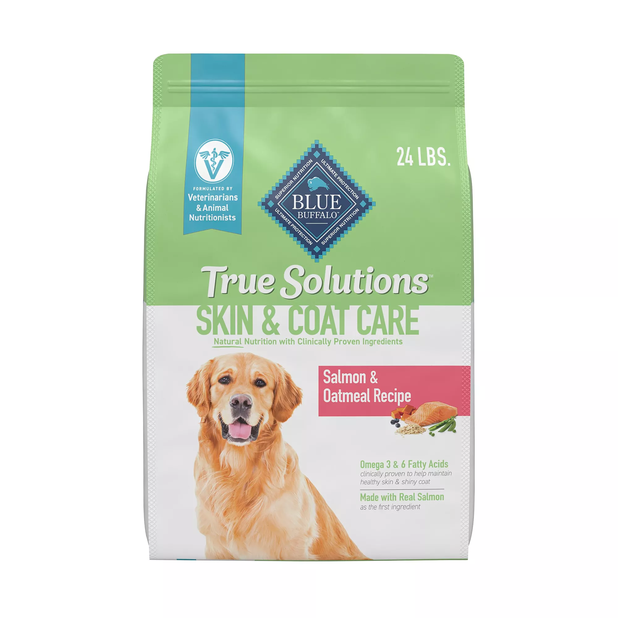 Contains one (1) 24 lb. bag of BLUE True Solutions Perfect Skin & Coat Adult Dog Food, Salmon