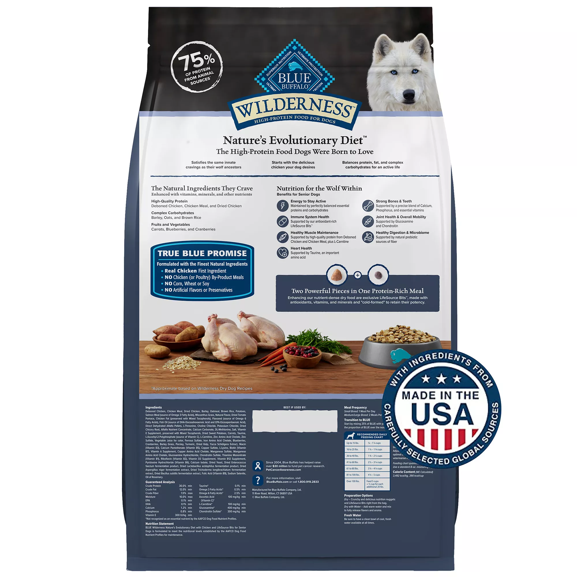 BLUE Wilderness Senior Dog Food is formulated with 75% protein from animal sources and real chicken as the first ingredient to satisfy your dog’s wild side. Blue Buffalo senior dog food also contains real fruits, vegetables, and other key nutrients to promote healthy muscle maintenance and provide energy to stay active. Like all Blue Buffalo natural dry dog foods recipes, this BLUE Wilderness chicken recipe is formulated without any chicken (or poultry) by-product meals….