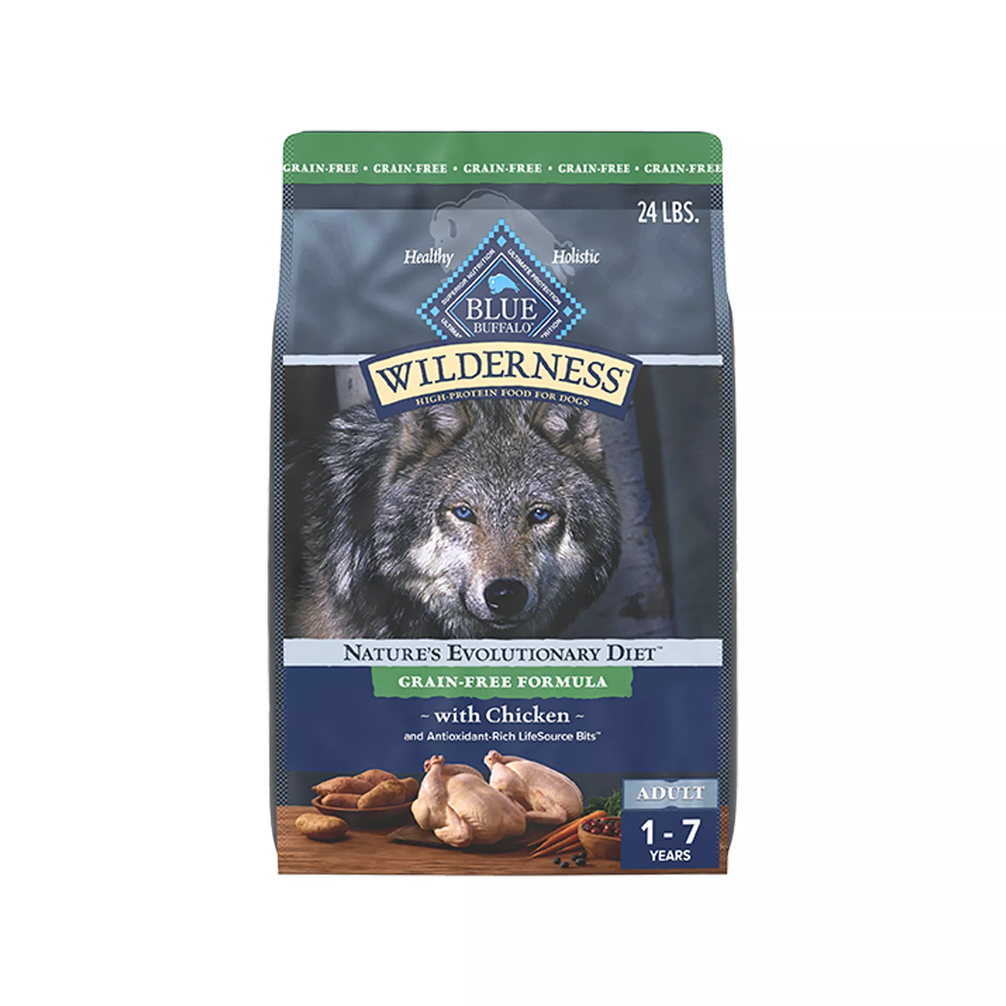 CONTAINS: One (1) 24 lb. bag of BLUE Wilderness Adult High-Protein Dry Dog Food with Real Chicken, Grain-Free, Made in the USA with Natural Ingredients, Chicken