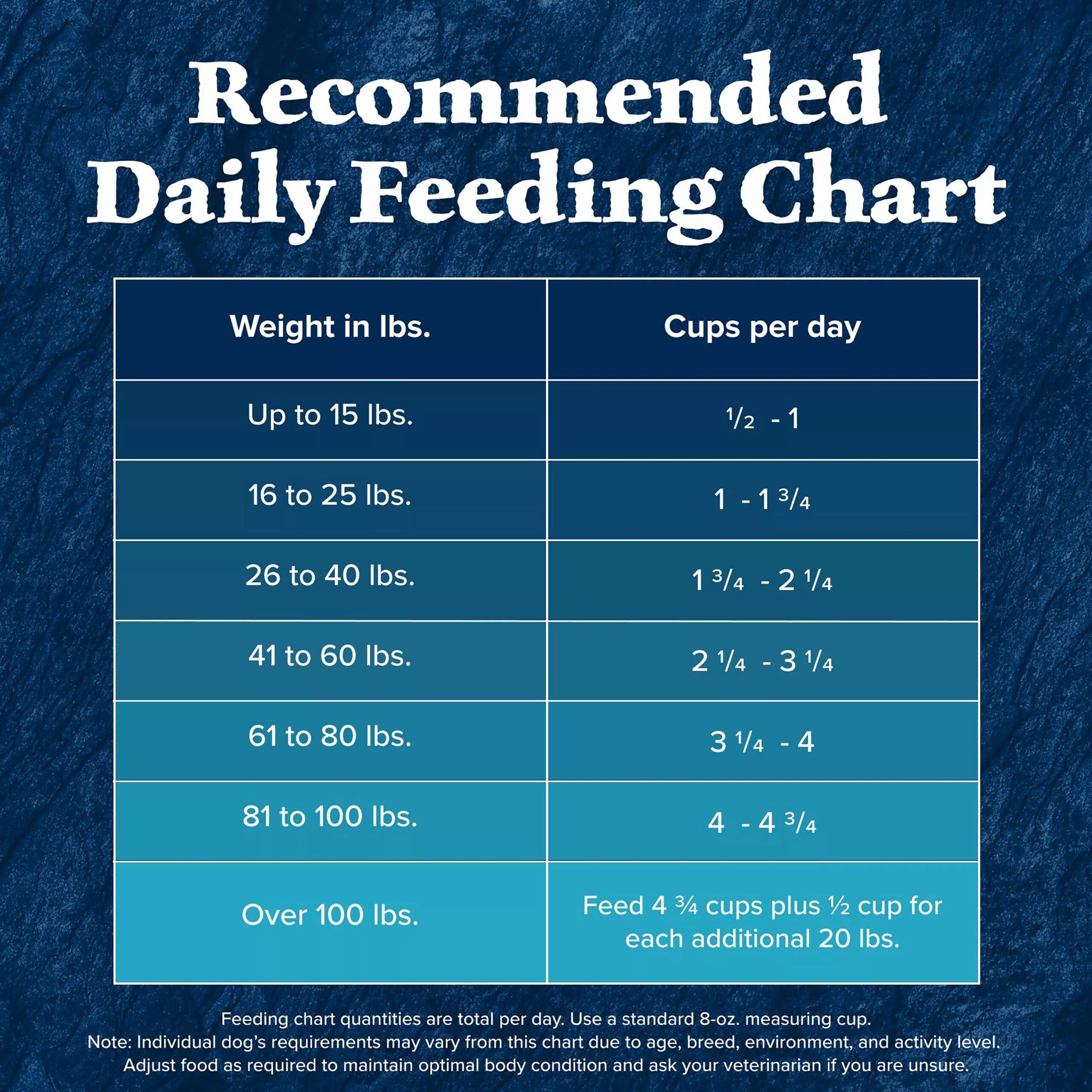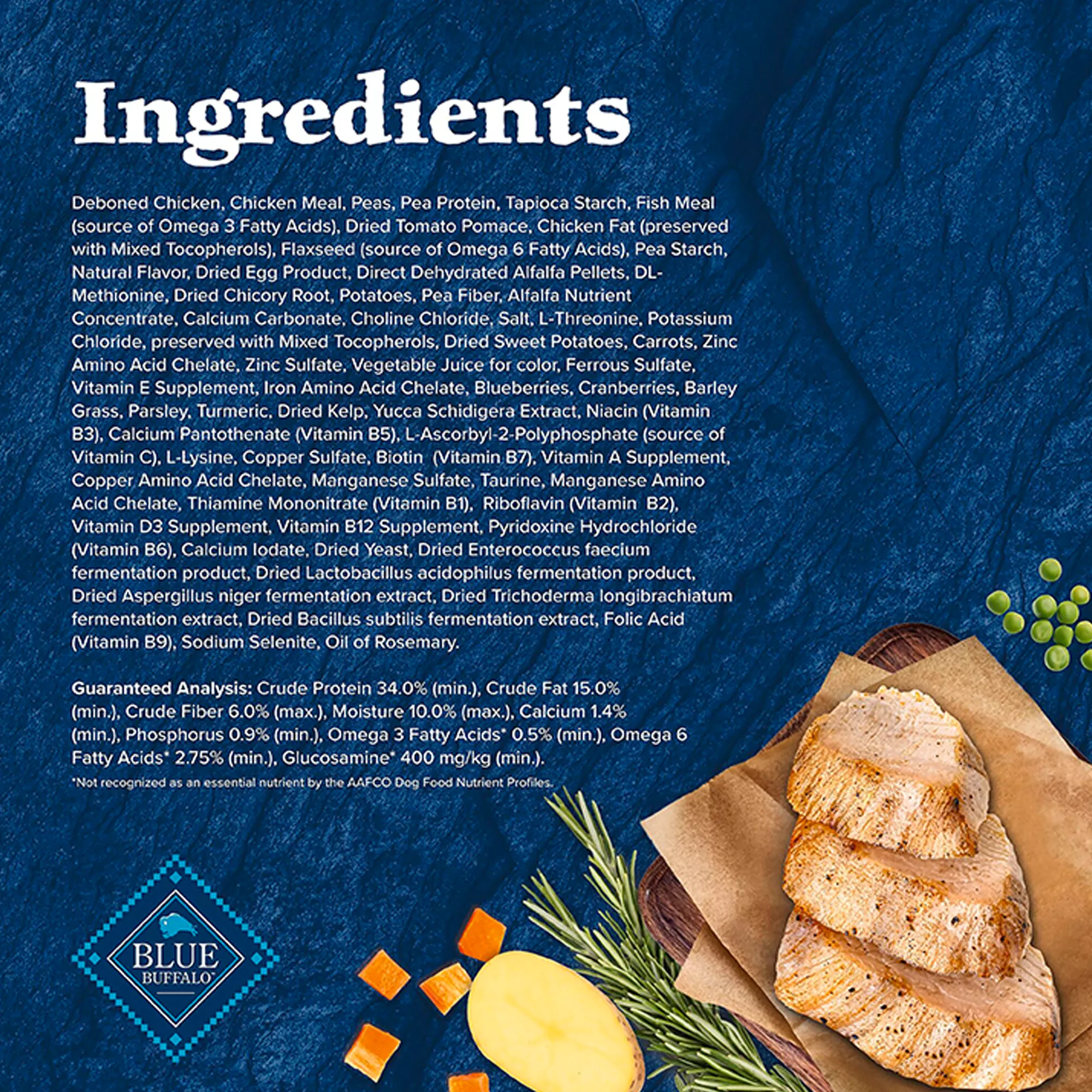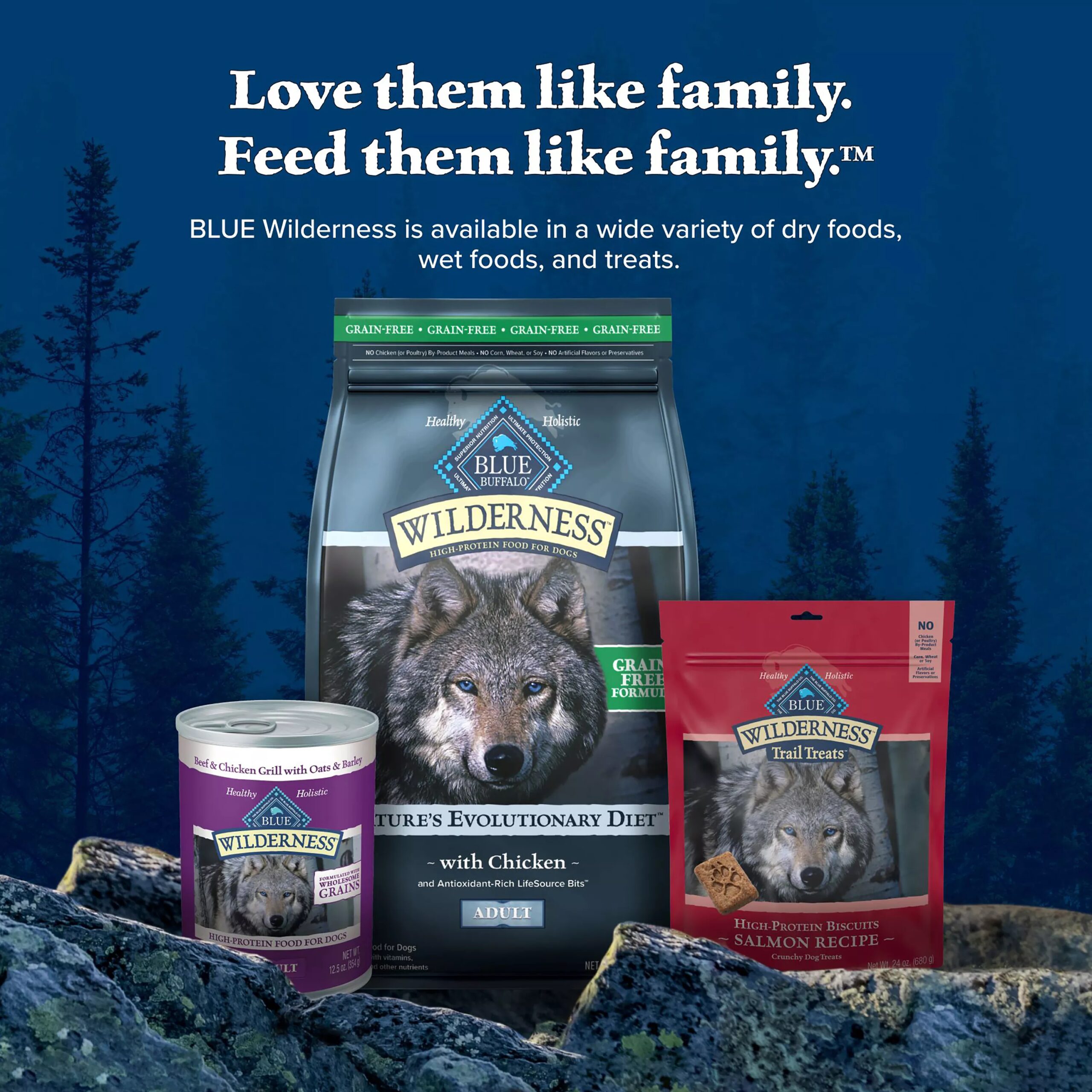 Like their ancestors before them, dogs were born to love meat. That’s why BLUE Wilderness high-protein dog food is packed with the meat dogs crave. With delicious real chicken as the first ingredient, Blue Buffalo Wilderness Natural Grain-Free Dry Food for Adult Dogs, Chicken Recipe provides natural, balanced nutrition to help your dog thrive while satisfying their wild side. This protein-rich, grain-free formula contains fats, complex carbohydrates, fruits, and vegetables for wholesome, well-rounded nutrition without the grains some Pet Parents choose to avoid. High-quality protein from deboned chicken helps your dog maintain strong, healthy, lean muscles. BLUE Wilderness dog foods are backed by the True BLUE Promise and always start with real, high-quality meat, poultry, or fish. They contain no chicken or poultry by-product meals, no corn, wheat, or soy, and no artificial flavors or preservatives. BLUE Wilderness is brought to you by Blue Buffalo, the leader in natural pet food. Love them like family. Feed them like family.