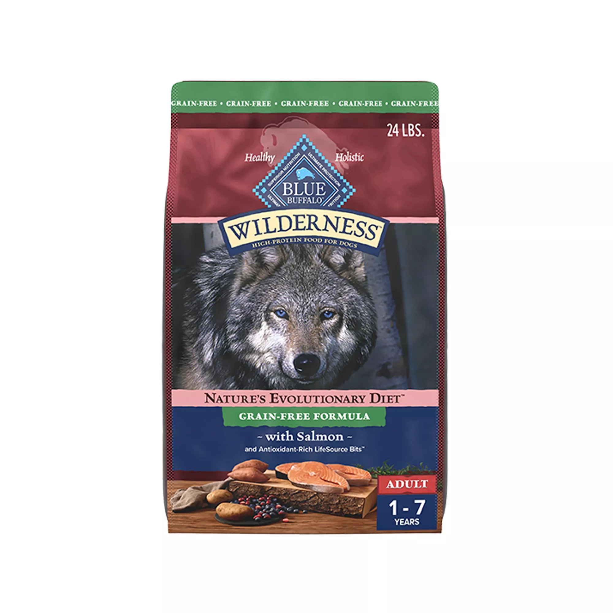 CONTAINS: One (1) 24 lb. bag of BLUE Wilderness Adult High-Protein Dry Dog Food with Real Salmon, Grain-Free, Made in the USA with Natural Ingredients, Salmon