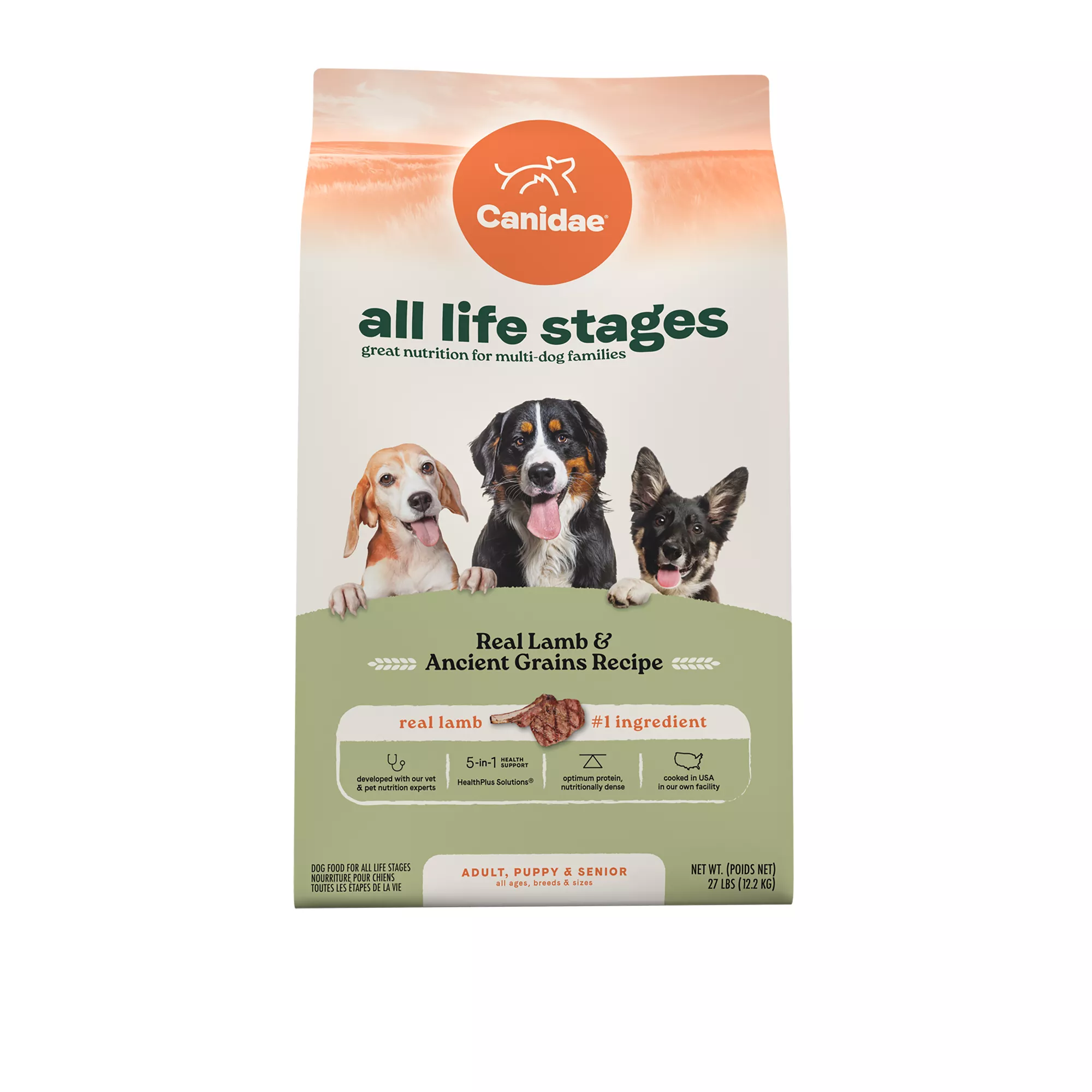 Canidae All Life Stages dry dog food offers the perfect choice for multi-dog households, providing complete and balanced nutrition for dogs of all ages, breeds, and sizes. Developed with our vet and pet nutrition experts, each premium dry dog food recipe is carefully crafted to meet the nutritional needs of puppies, adults, and seniors, making mealtimes easy for your multi-dog family. Our Lamb & Ancient Grains recipe, featuring real lamb as the first ingredient, delivers optimum, hig…