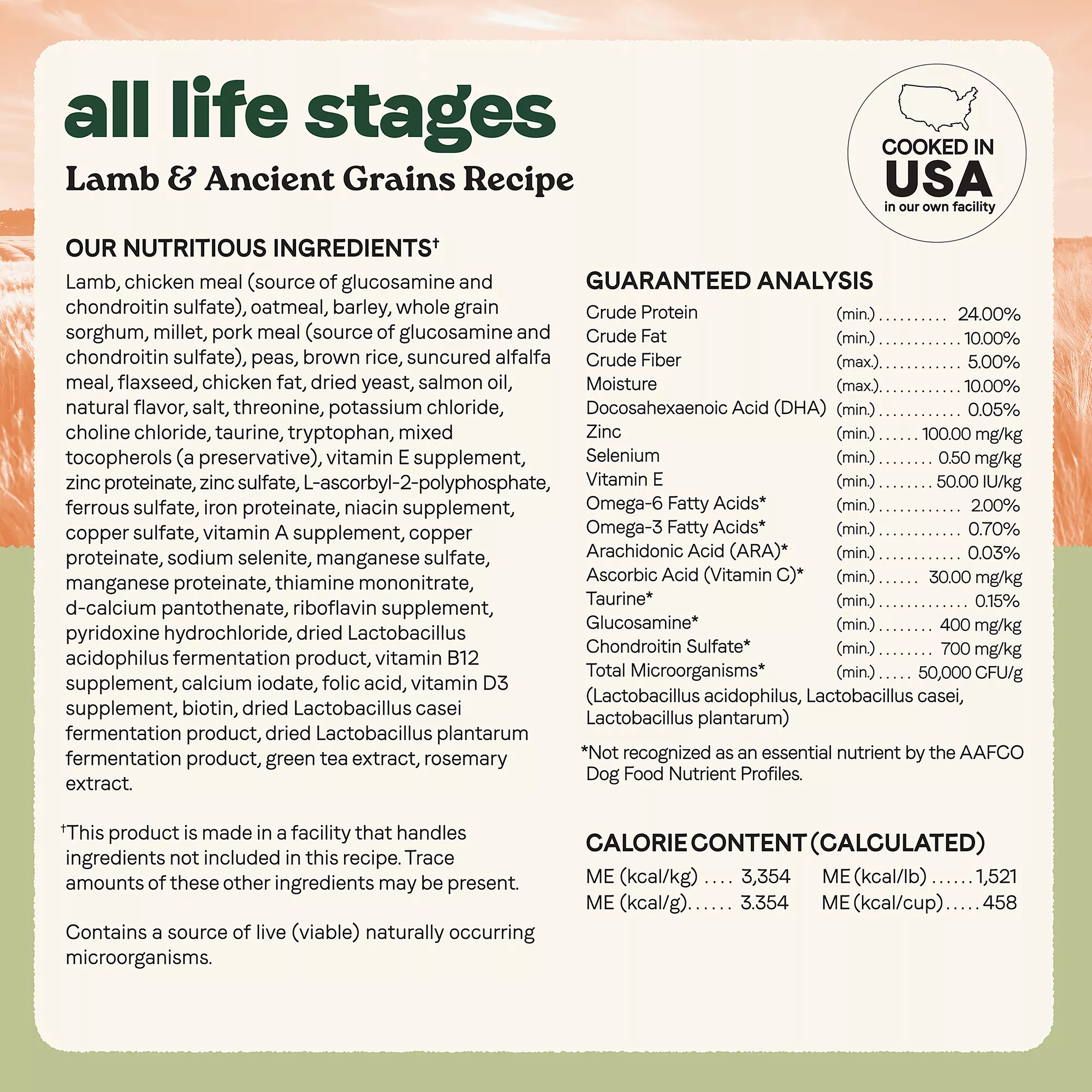 REAL LAMB FIRST: With real lamb as the first ingredient, our all life stages dog food ensures complete nutrition and a balanced diet for puppies, adults, and senior dogs. Lamb is a highly digestible protein and contains essential nutrients to support muscle health.