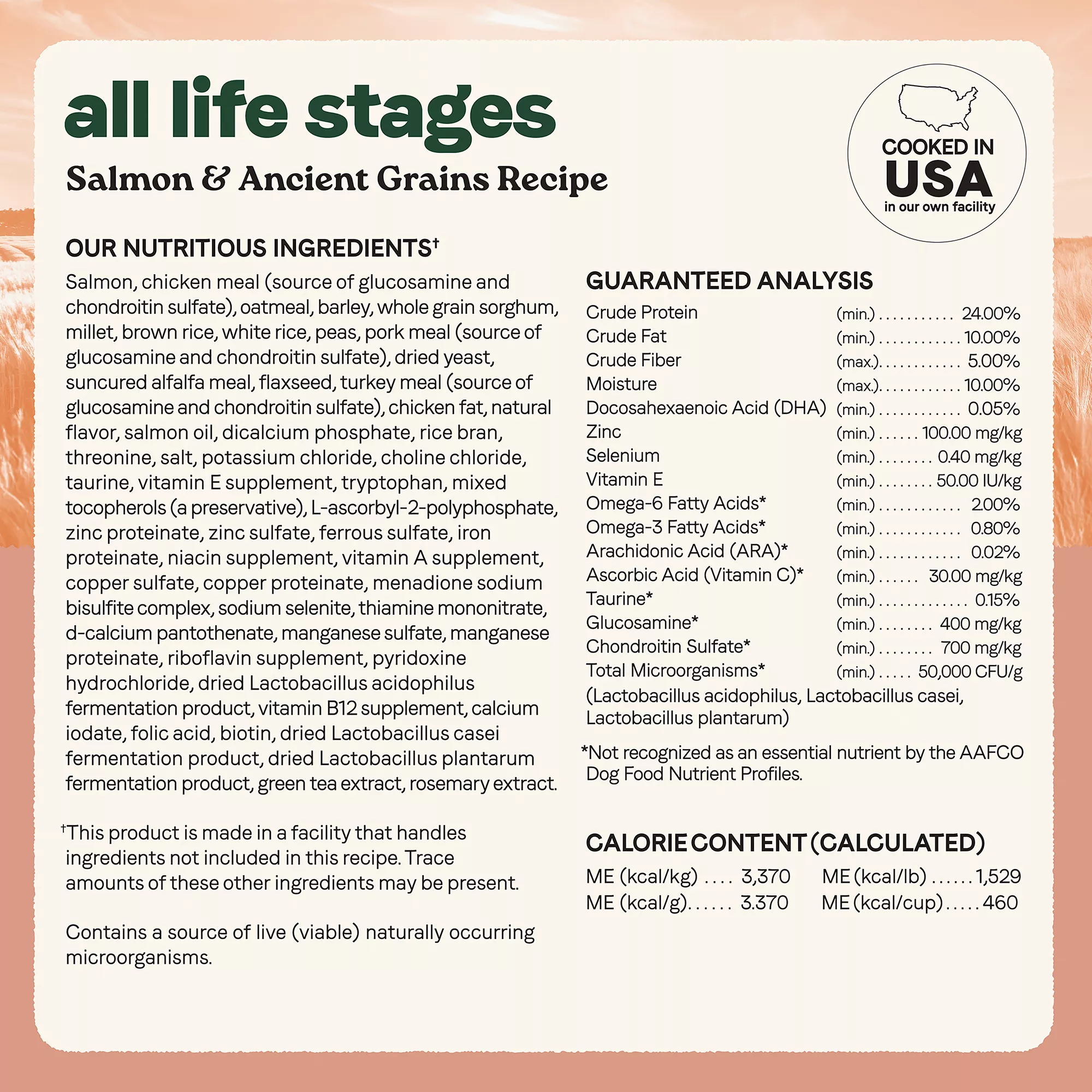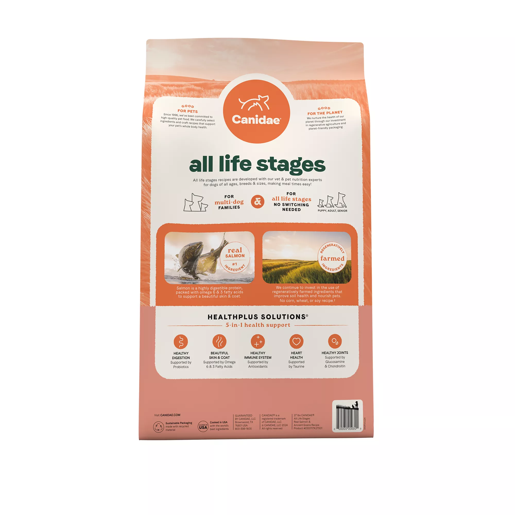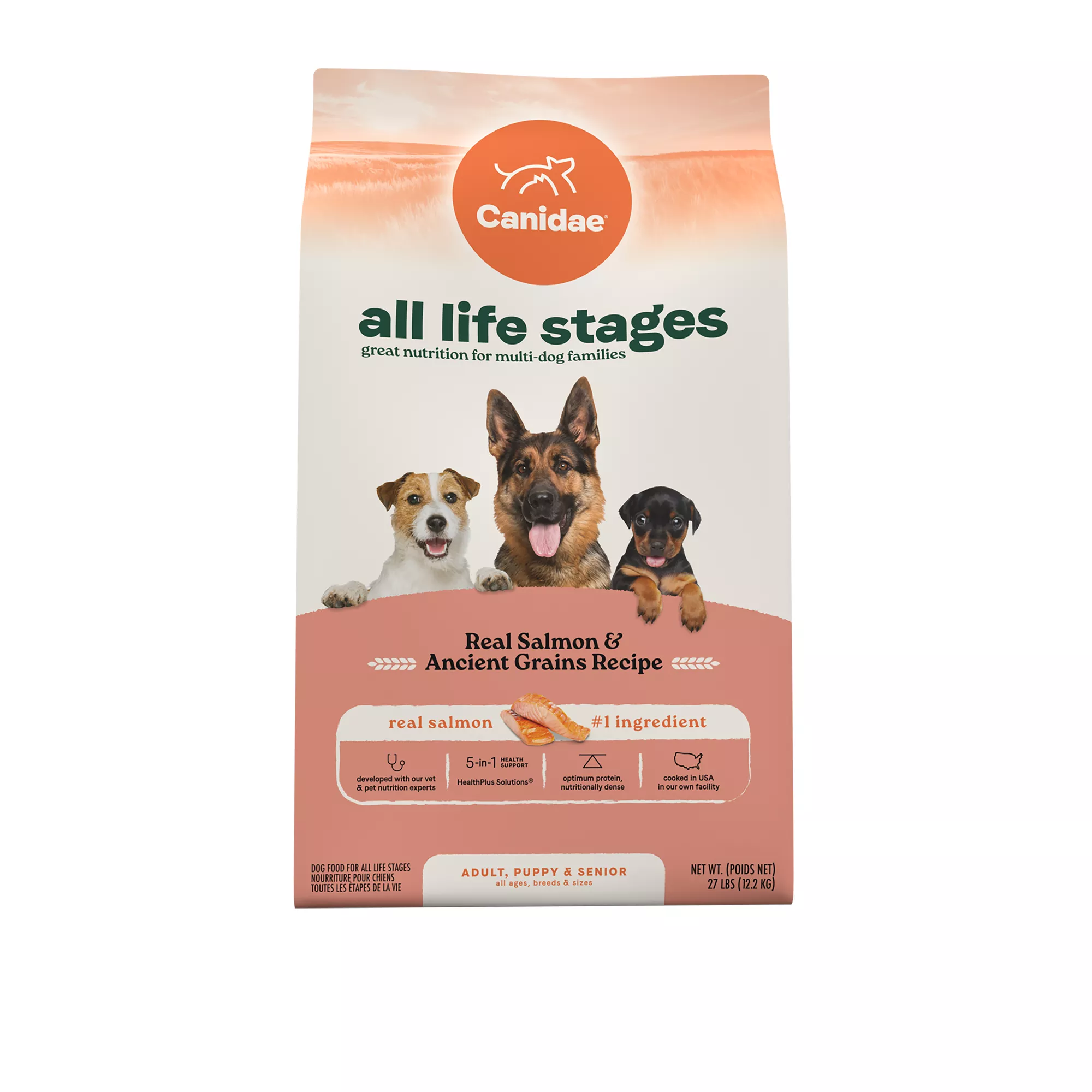 Canidae All Life Stages dry dog food is the perfect solution for multi-dog families, offering a convenient option for multi-dog households seeking an all-in-one dog food suitable for dogs of all ages, breeds, and sizes. Developed with our vet and pet nutrition experts, this premium dry dog food recipe is crafted to meet the nutritional requirements of puppies, adults, and seniors, making mealtimes easy for your multi-dog family with varying life stages. Our Salmon & Ancient Grains recipe, featuring real salmon as the first ingredient, delivers optimum, high protein levels to support healthy digestion, omega 6 & 3 fatty acids to support a beautiful skin & coat, and great taste. Our versatile all age dog food is fortified with a blend of probiotics, vitamins, minerals, and antioxidants, delivering health support for dogs at every life stage. Canidae was founded in 1996 and ever since has been committed to being good for pets and good for the planet, which is reflected in the high-quality pet food we cook in our own trusted US based facility, to our investments in regenerative agriculture and planet-friendly packaging. Treat your dogs to a nutrient-rich dog food suitable for all life stages with Canidae!
