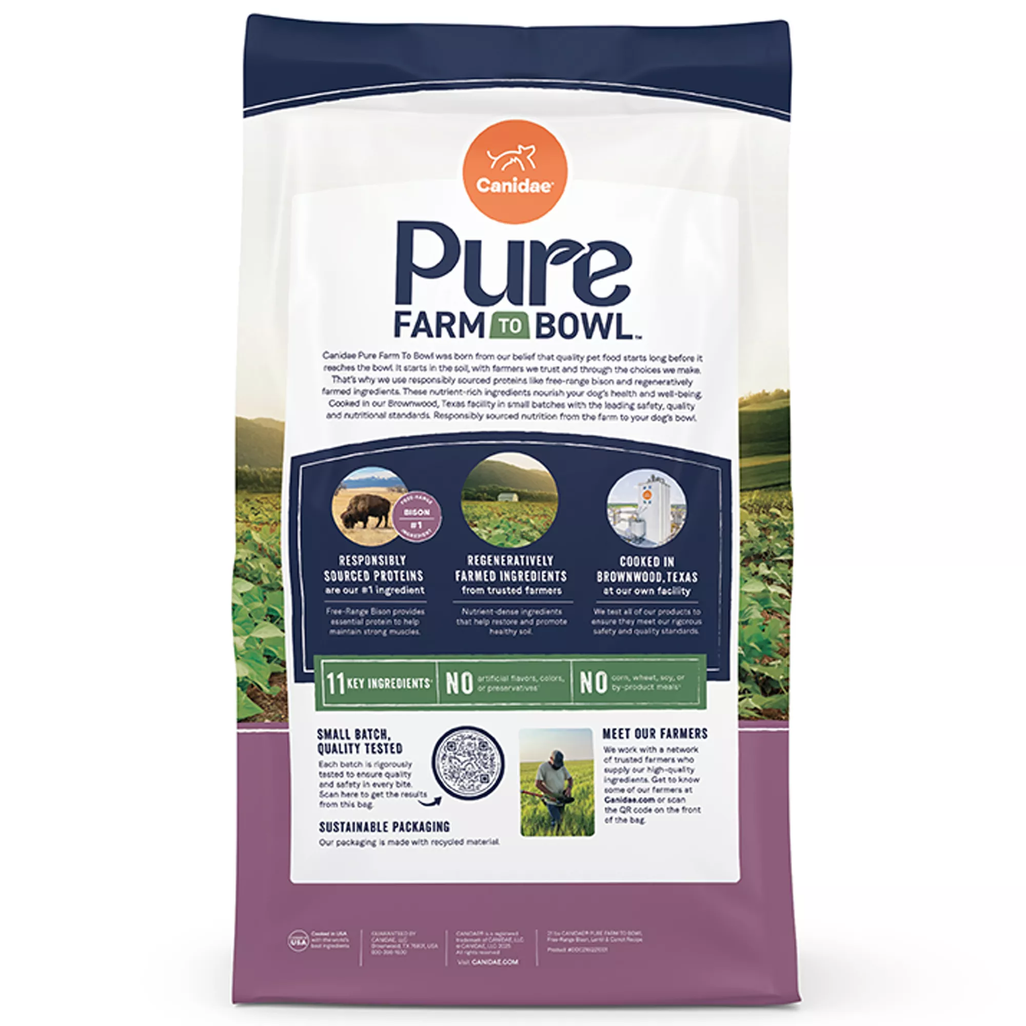 Description: Canidae Pure Farm To Bowl was born from our belief that quality pet food starts long before it reaches the bowl. It starts in the soil, with farmers we trust and through the choices we make. That’s why we use responsibly sourced proteins like wild caught salmon and regeneratively farmed ingredients that help restore soil and promote biodiversity. These nutrient-rich ingredients nourish your dog’s health and well-being. Cooked in our Brownwood, Texas facility in small batches with leading safety, quality and nutritional standards. Responsibly sourced nutrition from the farm to your dog’s bowl.