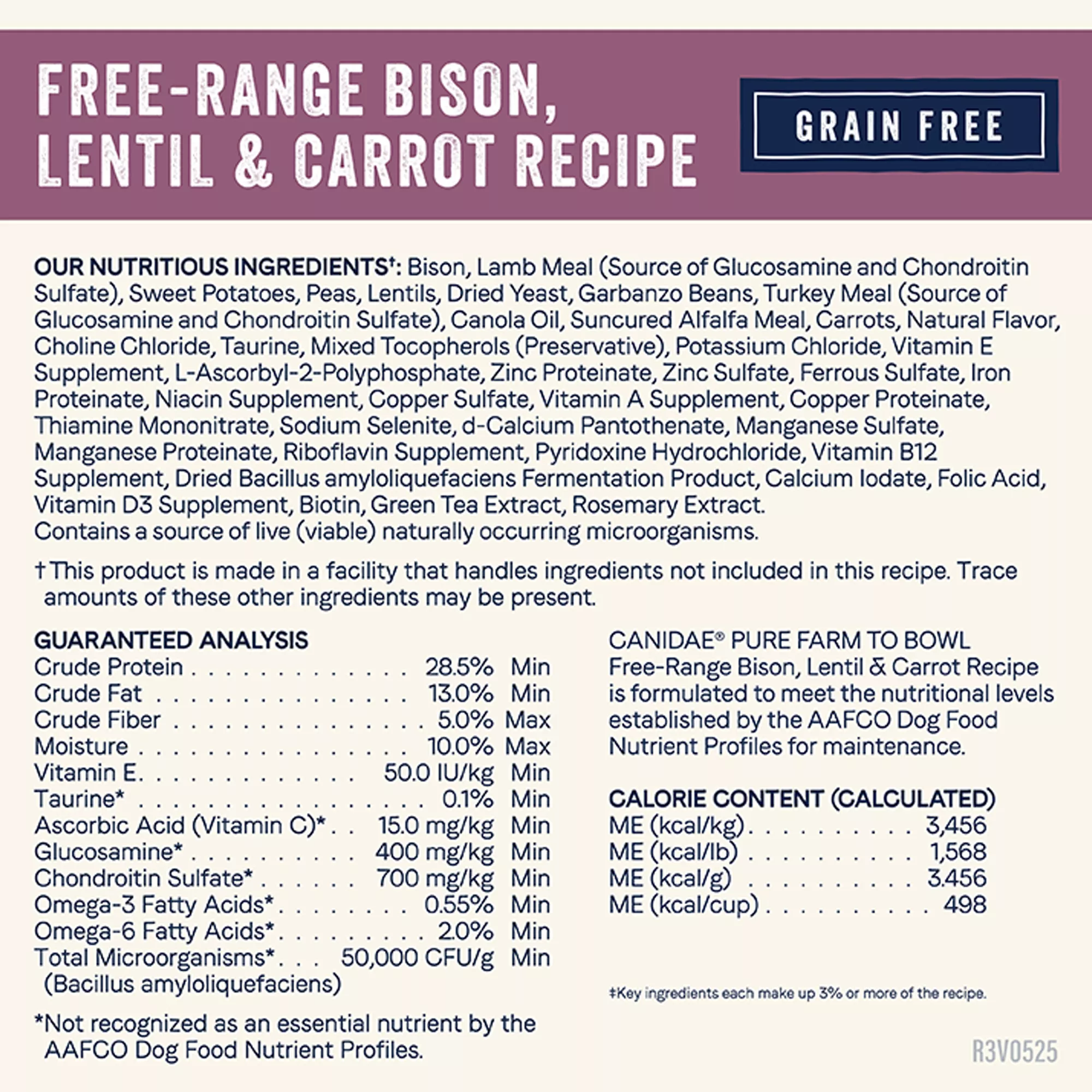 Ingredients: Bison, Lamb Meal (Source of Glucosamine and Chondroitin Sulfate), Sweet Potatoes, Peas, Lentils, Dried Yeast, Garbanzo Beans, Turkey Meal (Source of Glucosamine and Chondroitin Sulfate), Canola Oil, Suncured Alfalfa Meal, Carrots, Natural Flavor, Choline Chloride, Taurine, Mixed Tocopherols (Preservative), Potassium Chloride, Vitamin E Supplement, L-Ascorbyl-2-Polyphosphate, Zinc Proteinate, Zinc Sulfate, Ferrous Sulfate, Iron Proteinate, Niacin Supplement, Copper Sulfate, Vitamin A Supplement, Copper Proteinate, Thiamine Mononitrate, Sodium Selenite, d-Calcium Pantothenate, Manganese Sulfate, Manganese Proteinate, Riboflavin Supplement, Pyridoxine Hydrochloride, Vitamin B12 Supplement, Dried Bacillus amyloliquefaciens Fermentation Product, Calcium Iodate, Folic Acid, Vitamin D3 Supplement, Biotin, Green Tea Extract, Rosemary Extract.