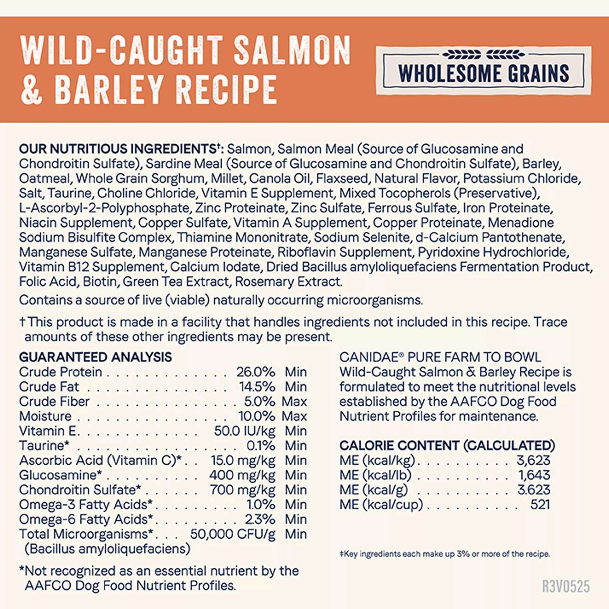 Guaranteed Analysis: Guaranteed Analysis Crude Protein (min.) 26.0%; Crude Fat (min.) 14.5%; Crude Fiber (max.) 5.0%; Moisture (max.) 10.0%; Vitamin E (min.) 50.0 IU?kg; Taurine* (min.) 0.1%; Ascorbic Acid* (Vitamin C)(min) 15.0 mg?kg; Glucosamine* (min.) 400 mg?kg; Chondroitin Sulfate * (min.) 700 mg?kg;Omega-3 Fatty Acids* (min.) 1.0%; Omega-6 Fatty Acids* (min.) 2.3%; Total Microorganisms* (Bacillus amyloliquefaciens) 50,000 CFU?g *Not recognized as an essential nutrient by the AAFCO Dog Food Nutrient Profiles.