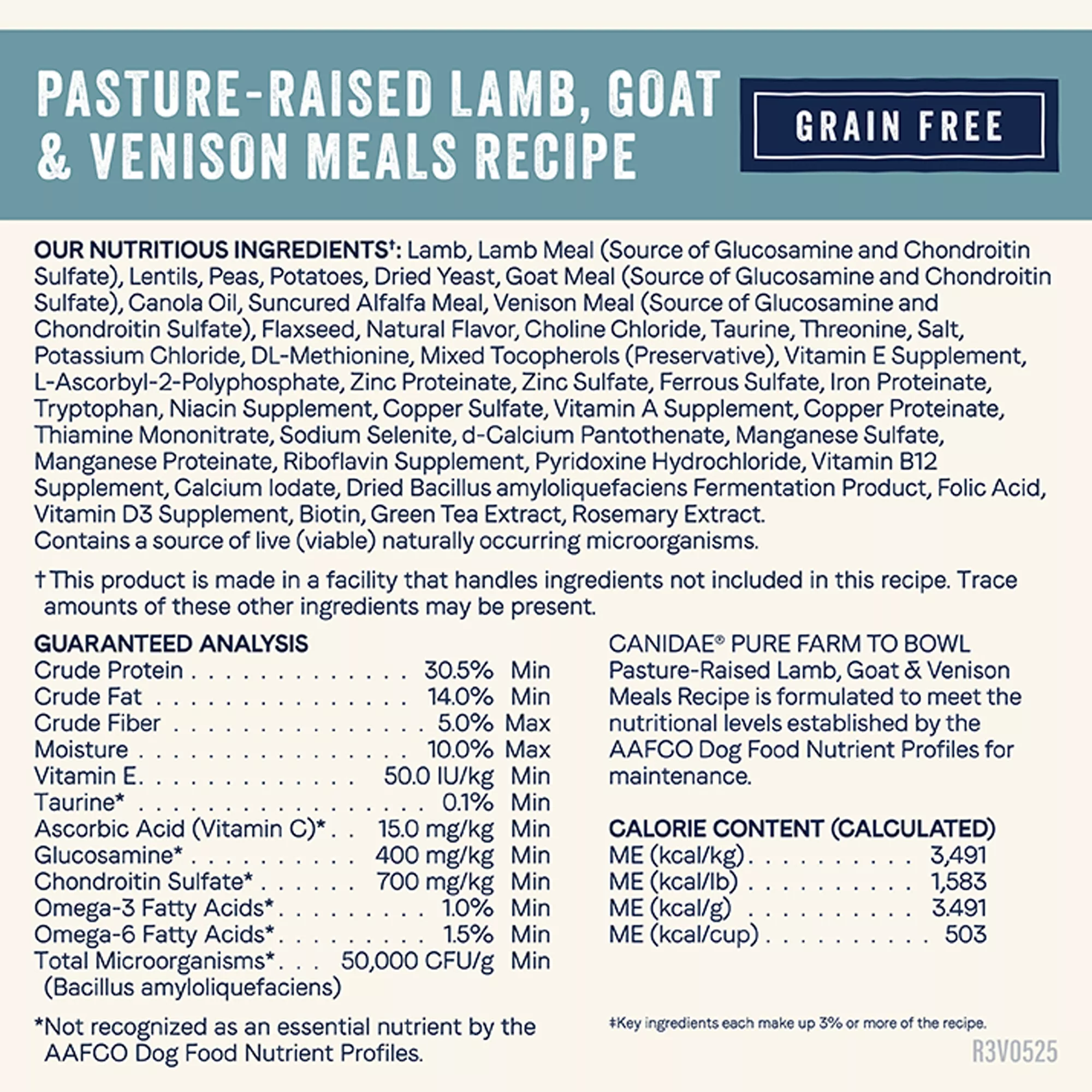 Ingredients: Lamb, Lamb Meal (Source of Glucosamine and Chondroitin Sulfate), Lentils, Peas, Potatoes, Dried Yeast, Goat Meal (Source of Glucosamine and Chondroitin Sulfate), Canola Oil, Suncured Alfalfa Meal, Venison Meal (Source of Glucosamine and Chondroitin Sulfate), Flaxseed, Natural Flavor, Choline Chloride, Taurine, Threonine,