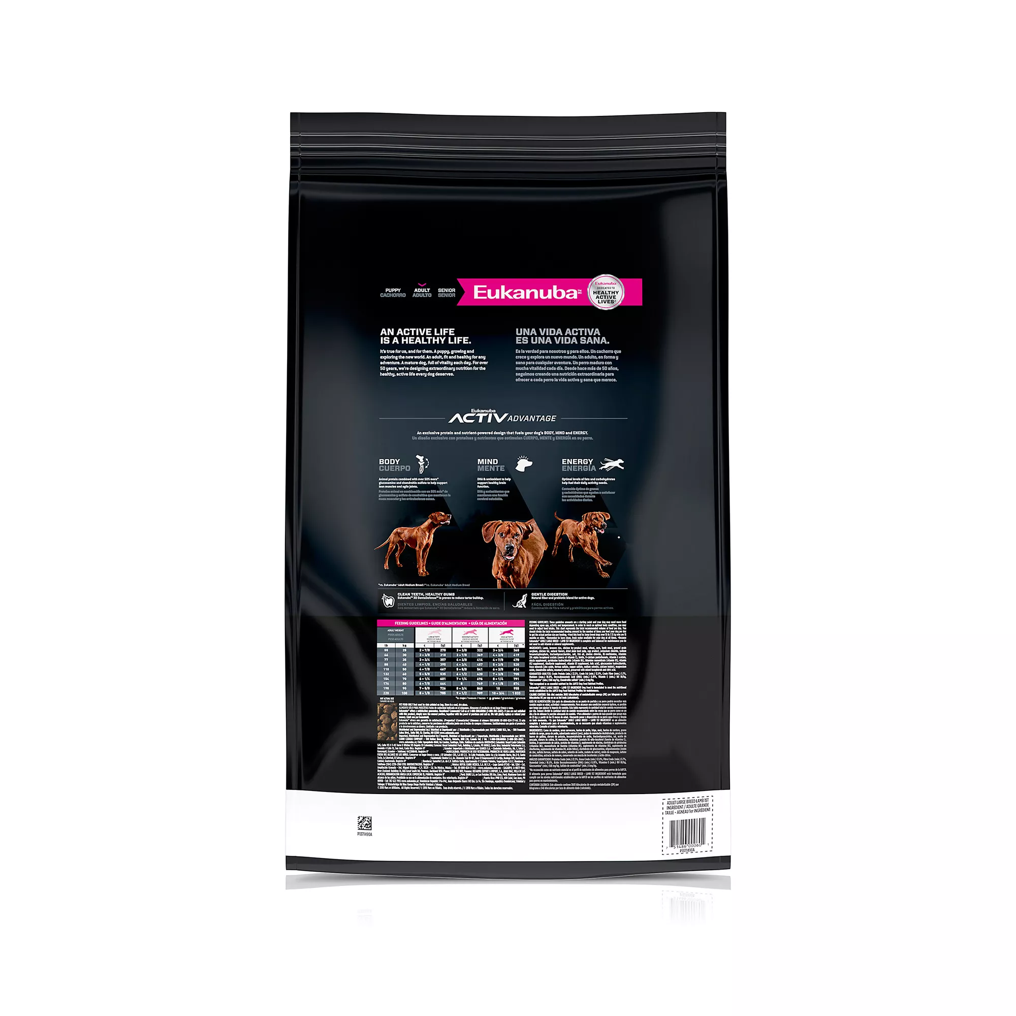 Description: Your large dog is anything but ordinary, and they can benefit from extraordinary nutrition to help them perform their best. Feed your companion’s body, mind and energy with Eukanuba(?) Lamb 1st Ingredient Adult Large Breed Dog Food Dry Formula. Animal protein, glucosamine, and chondroitin sulfate support lean muscles and agile joints. DHA and vitamin E help support healthy brain function. The dry large dog food is formulated with optimal levels of fats and carbohydrates to help fuel an active lifestyle. Crunchy texture, s shaped kibble and a polyphosphate in the 3D DentaDefense support dog dental care by reducing tartar buildup for clean teeth and healthy gums. The healthy dog food contains a blend of prebiotics and natural fiber for dogs, aiding gentle digestion to help keep your dog healthy. Plus, high?quality lamb is the first ingredient in this adult large breed dry dog food to power your active dog’s day. Mix this adult dog food kibble with yourdog’s favorite Eukanuba wet food for the perfect complement. Your dog helps make your life extraordinary. Return the favor by feeding them Eukanuba and discover the extraordinary in every day.