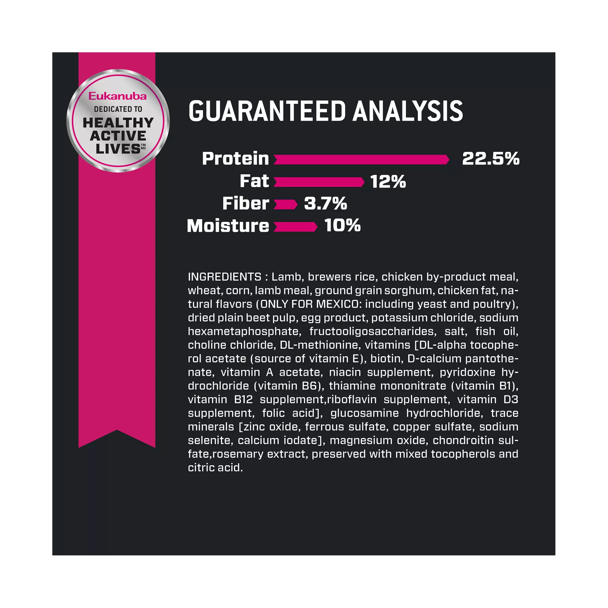 Guaranteed Analysis: Crude Protein (min.) 22.5%, Crude Fat (min.) 12.0%, Crude Fiber (max.) 3.7%, Moisture (max.) 10.0%, Docosahexaenoic Acid (DHA) (min.) 0.01%, Vitamin E (min.) 161 IU/kg, Glucosamine* (min.) 368 mg/kg, Chondroitin sulfate* (min.) 8 mg/kg. *Not recognized as an essential nutrient by the AAFCO Dog Food Nutrient Profiles.