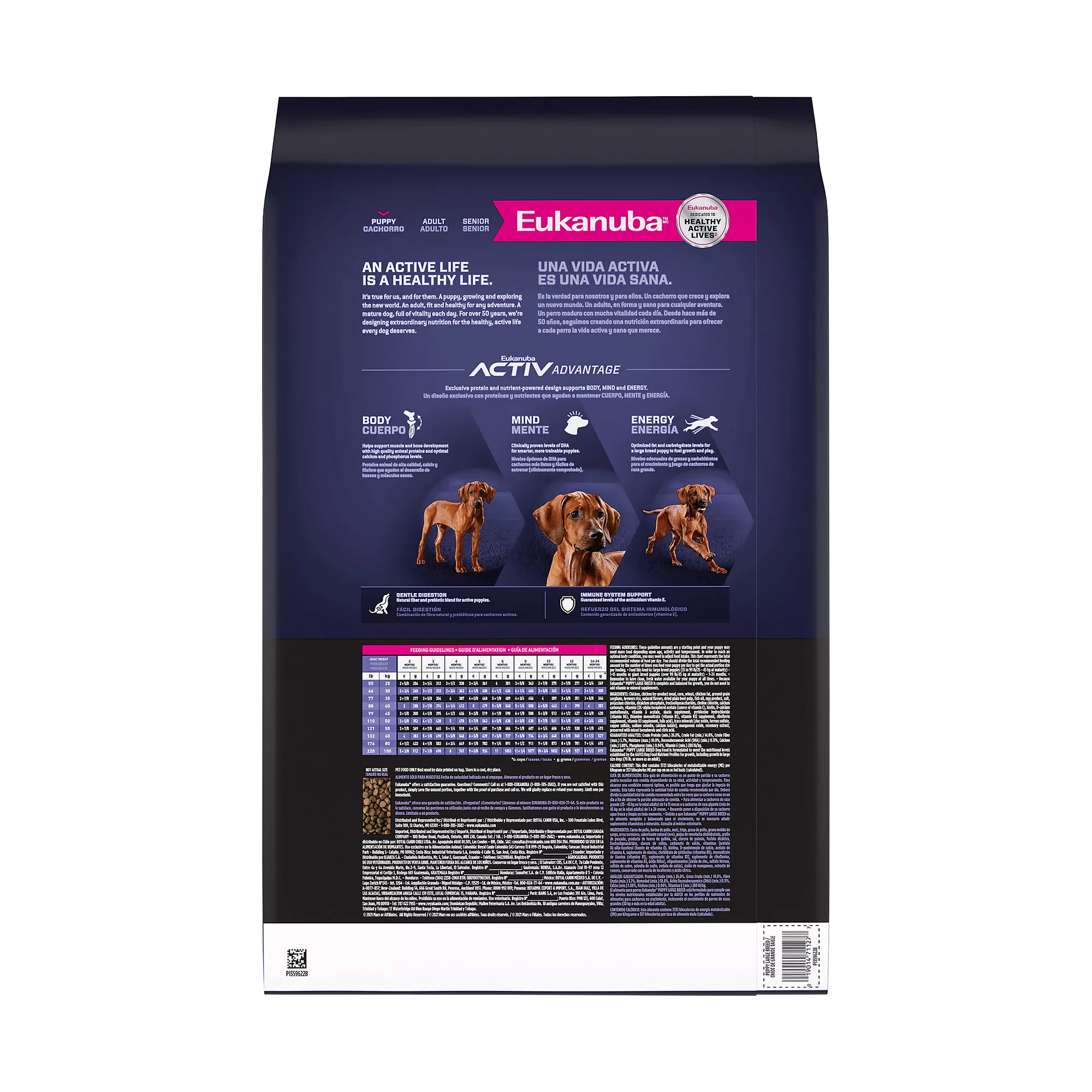 Description: Help unleash your puppy’s extraordinary potential with Eukanuba(?) Puppy Large Breed Dry Dog Food. This complete and balanced large breed dry puppy food is made to fuel your growing companion’s body, mind and energy levels. High-quality animal protein and optimal levels of calcium and phosphorus help support the optimal growth rate of your large breed puppy. This dog dry food is formulated with clinically proven levels of DHA for smarter, more trainable puppies. The puppy dog food is designed with optimized fat and carbohydrate levels to provide concentrated energy for growth and play. A blend of prebiotics and natural fiber for dogs aids digestion. Guaranteed levels of the antioxidant vitamin E help support your little champion’s developing immune system. Plus, high-quality chicken is the first ingredient in this large breed puppy food to power your big dog’s day. With over 50 years of scientific research and observation, Eukanuba continues to deliver targeted nutrition to feed every pet’s specific needs. Your big puppy is destined for great things. So, fill their bowls with puppy essentials and the vitamins for dogs your pup needs. Serve up Eukanuba Large Breed Puppy Dog Dry Food for a lifetime of extraordinary.