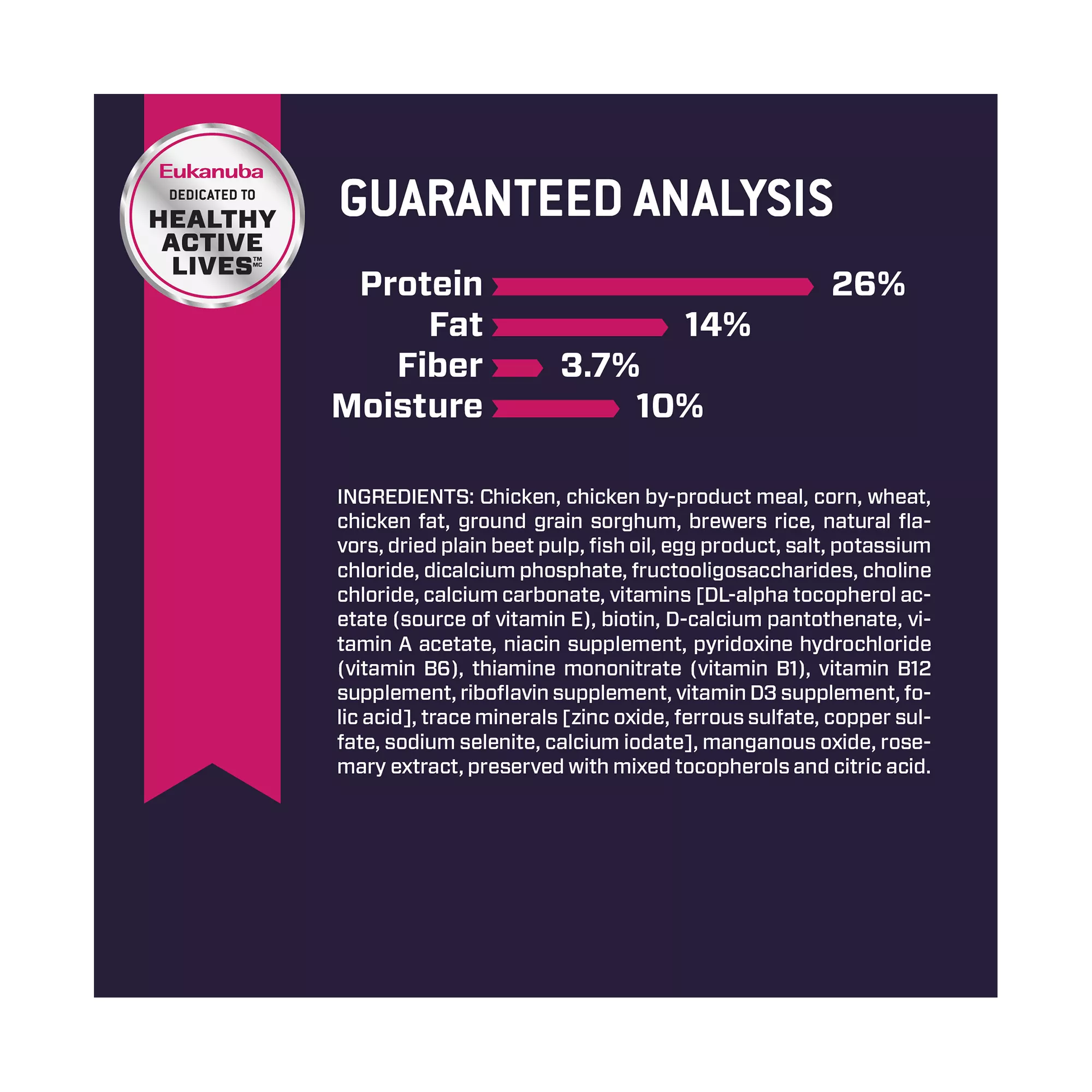 Ingredients: Chicken, chicken by-product meal, corn, wheat, chicken fat, ground grain sorghum, brewers rice, natural flavors, dried plain beet pulp, fish oil, egg product, salt, potassium chloride, dicalcium phosphate, fructooligosaccharides, choline chloride, calcium carbonate, vitamins[DL-alpha tocopherol acetate (source of vitamin E), biotin, D-calcium pantothenate, vitamin A acetate, niacin supplement, pyridoxine hydrochloride (vitamin B6), thiamine mononitrate (vitamin B1), vitamin B12 supplement, riboflavin supplement, vitamin D3 supplement, folic acid], trace minerals[zinc oxide, ferrous sulfate, copper sulfate, sodium selenite, calcium iodate], manganous oxide, rosemary extract, preserved with mixed tocopherols and citric acid.