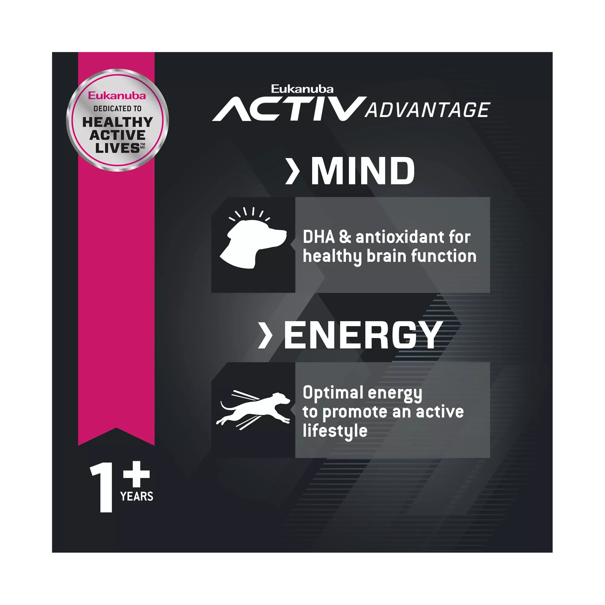 Features & Benefits: Eukanuba Adult Medium Breed Dog Dry Food Formula for medium breed dogs over 12 months and 24?54 lbs. High?quality animal protein for dogs helps support lean muscles and agile joints in active dogs. Dry dog food for medium dogs with DHA and vitamin E supports healthy brain function. Fat and carbohydrate levels provide concentrated energy beneficial for active adult dogs. High?quality chicken in this crunchy dog kibble protein to power their active lifestyle.