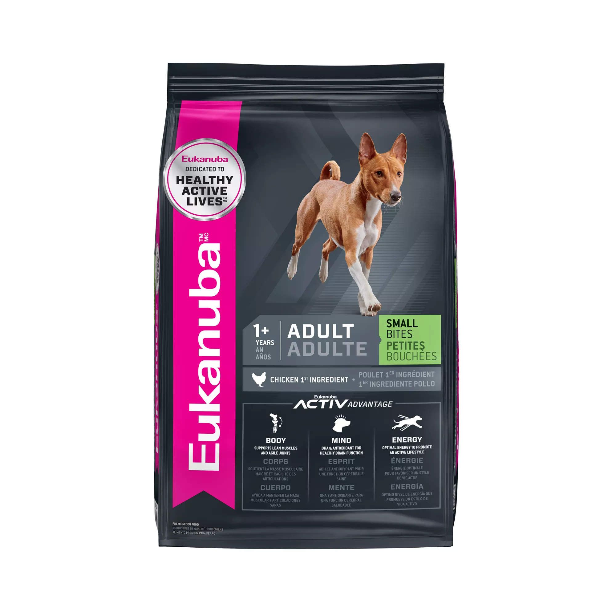 Description: Your dog is anything but ordinary, and they can benefit from extraordinary nutrition to help them perform their best. Feed your companion Eukanuba(?) Adult Small Bites Dog Food Dry Formula, a diet created specifically for your dog’s body, mind and energy. The tiny, bite?sized kibble in this adult dog food is designed for dogs who prefer smaller kibble size. Animal protein, glucosamine, and chondroitin sulfate in the Small Bites dog food support lean muscles and agile joints. DHA and vitamin E help support healthy brain function. Optimal levels of fats and carbohydrates in the dog dry food formula help fuel an active lifestyle. A crunchy texture, S?shaped kibble and a polyphosphate in the 3D DentaDefense help reduce tartar buildup for clean teeth and healthy gums. A natural blend of prebiotics and fiber for dogs helps keep your dog healthy. Plus, high?quality chicken is the first ingredient in this healthy dog food to power your dog’s day.Your dog helps make your life extraordinary. Return the favor by feeding them Eukanuba and fuel the extraordinary in every day.