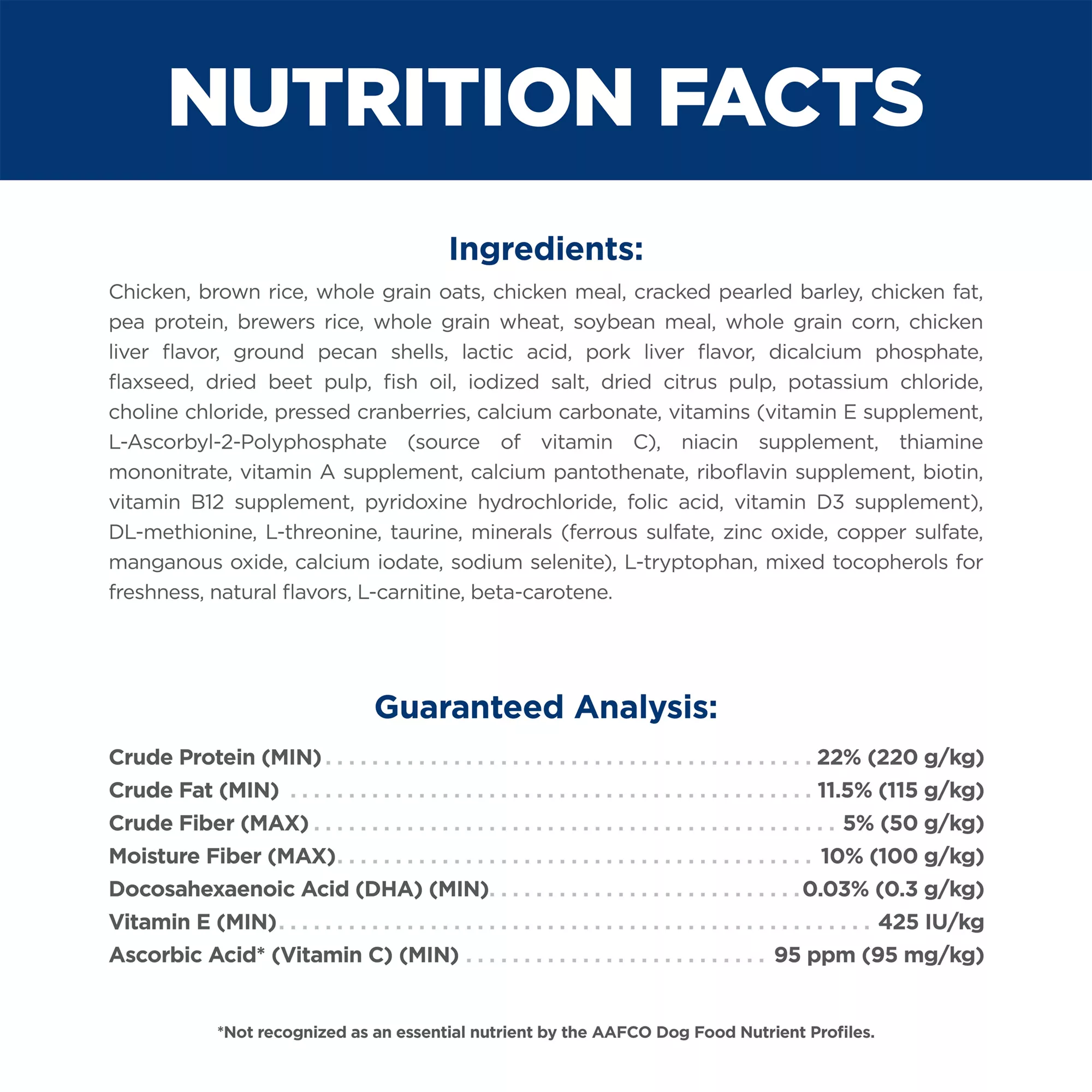Ingredients: Chicken, Brown Rice, Whole Grain Oats, Chicken Meal, Cracked Pearled Barley, Chicken Fat, Pea Protein, Brewers Rice, Whole Grain Wheat, Soybean Meal, Whole Grain Corn, Chicken Liver Flavor, Ground Pecan Shells, Lactic Acid, Pork Liver Flavor, Dicalcium Phosphate, Flaxseed, Dried Beet Pulp, Fish Oil, Iodized Salt, Dried Citrus Pulp, Potassium Chloride, Choline Chloride, Pressed Cranberries, Calcium Carbonate, vitamins (Vitamin E Supplement, L?Ascorbyl?2?Polyphosphate (source of Vitamin C), Niacin Supplement, Thiamine Mononitrate, Vitamin A Supplement, Calcium Pantothenate, Riboflavin Supplement, Biotin, Vitamin B12 Supplement, Pyridoxine Hydrochloride, Folic Acid, Vitamin D3 Supplement), DL?Methionine, L?Threonine, Taurine, minerals (Ferrous Sulfate, Zinc Oxide, Copper Sulfate, Manganous Oxide, Calcium Iodate, Sodium Selenite), L?Tryptophan, Mixed Tocopherols for freshness, Natural Flavors, L?Carnitine, Beta?Carotene.