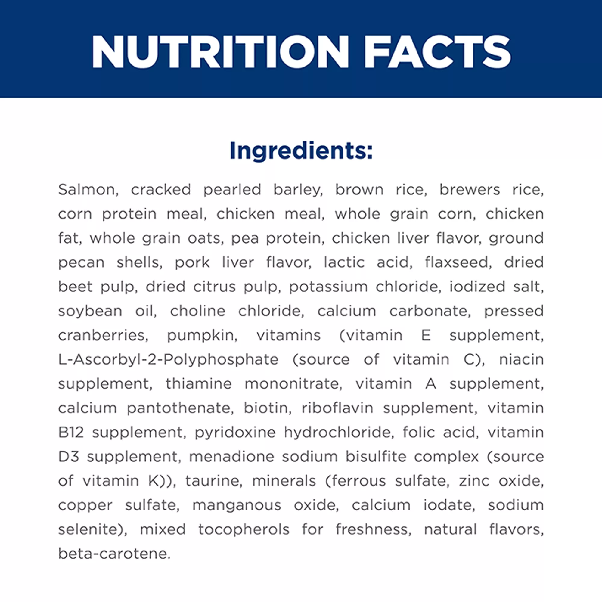 Hill’s Science Diet Adult Perfect Digestion Salmon Dry Dog Food contains prebiotics, which are nutrients that feed the billions of microbes in the gut microbiome that are essential for good health. Our breakthrough blend of prebiotics, ActivBiome+, supports each pet’s unique microbiome for healthy digestion and overall well-being. This delicious recipe with salmon provides balanced nutrition for overall wellness to help your pet feel their best, and helps your pet’s body absorb & use vital nutrients. Meanwhile, high-quality protein from salmon & other ingredients helps maintain lean muscles, and balanced nutrition and minerals support vital organ health.