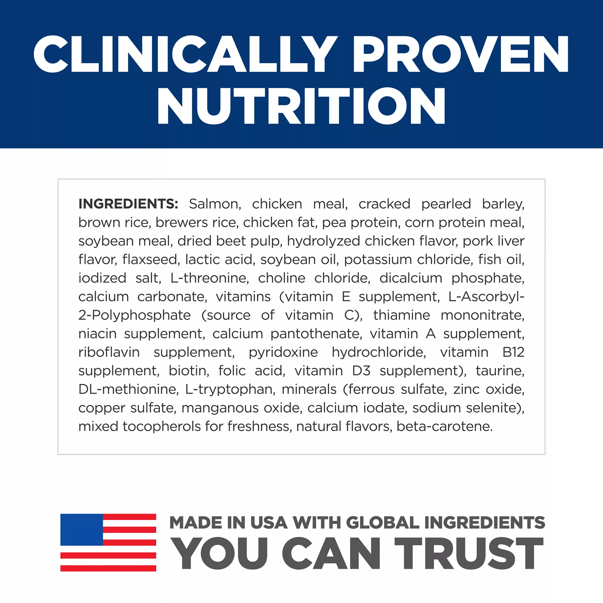 DL-Methionine, L-Tryptophan, minerals (Ferrous Sulfate, Zinc Oxide, Copper Sulfate, Manganous Oxide, Calcium Iodate, Sodium Selenite), Mixed Tocopherols for freshness, Natural Flavors, Beta-Carotene.