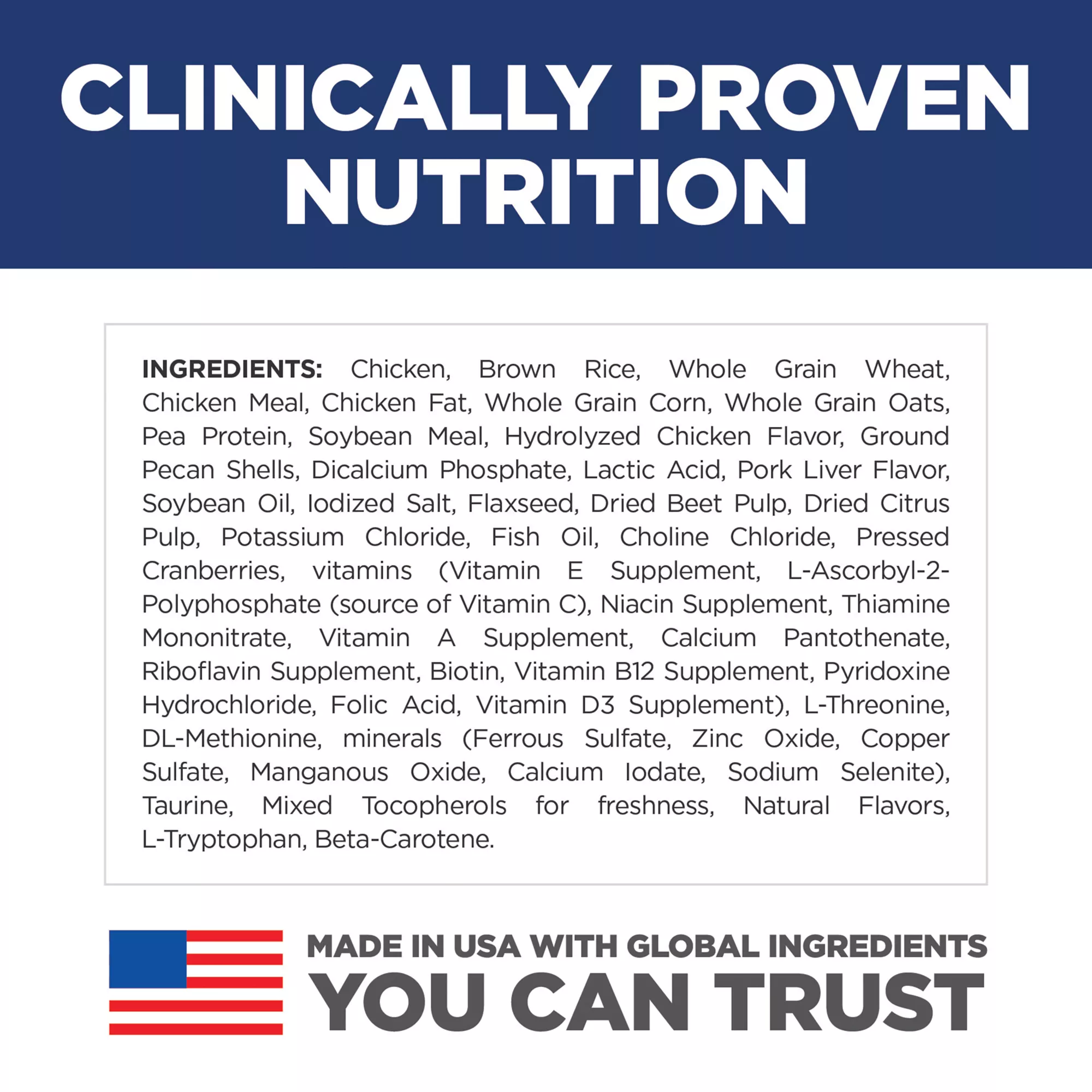 Ingredients: Chicken, Brown Rice, Whole Grain Wheat, Chicken Meal, Chicken Fat, Whole Grain Corn, Whole Grain Oats, Pea Protein, Soybean Meal, Hydrolyzed Chicken Flavor, Ground Pecan Shells, Dicalcium Phosphate, Lactic Acid, Pork Liver Flavor, Soybean Oil, Iodized Salt, Flaxseed, Dried Beet Pulp, Dried Citrus Pulp, Potassium Chloride, Fish Oil, Choline Chloride, Pressed Cranberries, vitamins (Vitamin E Supplement, L?Ascorbyl?2?Polyphosphate (source of Vitamin C), Niacin Supplement, Thiamine Mononitrate, Vitamin A Supplement, Calcium Pantothenate, Riboflavin Supplement, Biotin, Vitamin B12 Supplement, Pyridoxine Hydrochloride, Folic Acid, Vitamin D3 Supplement), L?Threonine, DL?Methionine, minerals (Ferrous Sulfate, Zinc Oxide, Copper Sulfate, Manganous Oxide, Calcium Iodate, Sodium Selenite), Taurine, Mixed Tocopherols for freshness, Natural Flavors, L?Tryptophan, Beta?Carotene.