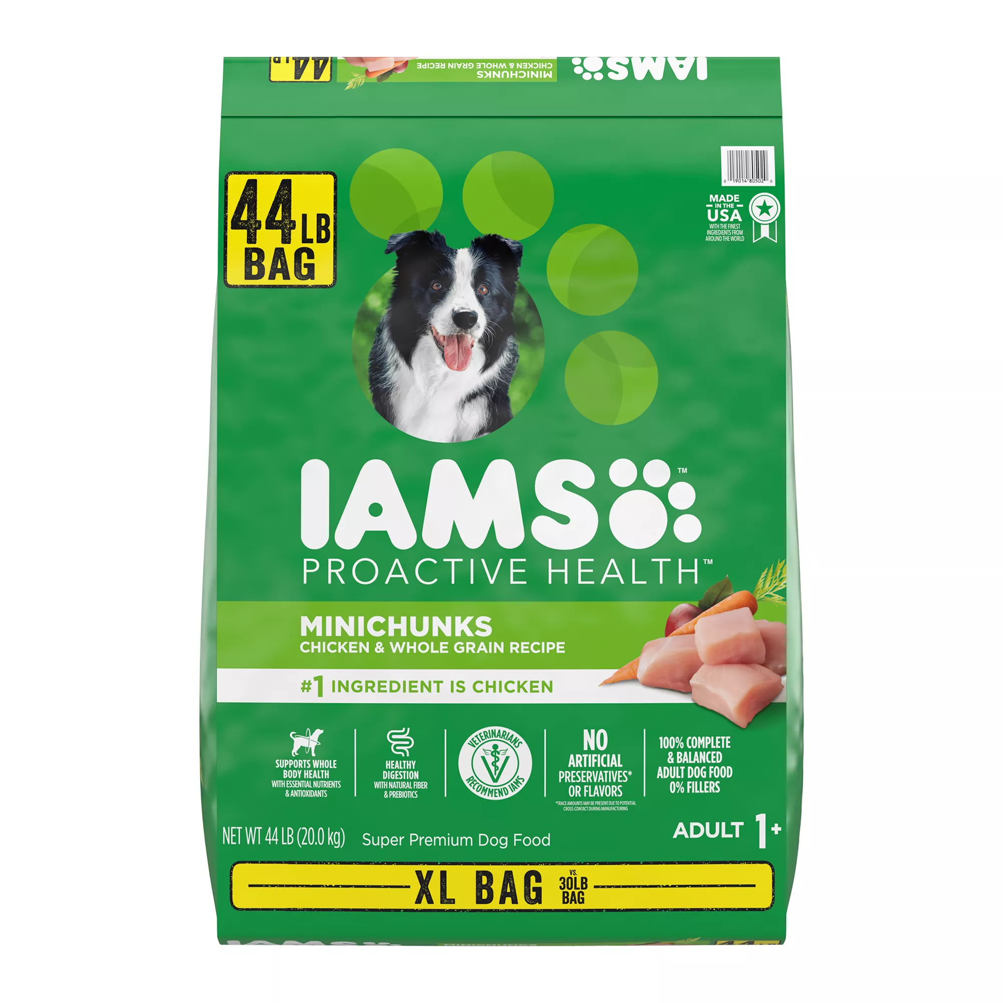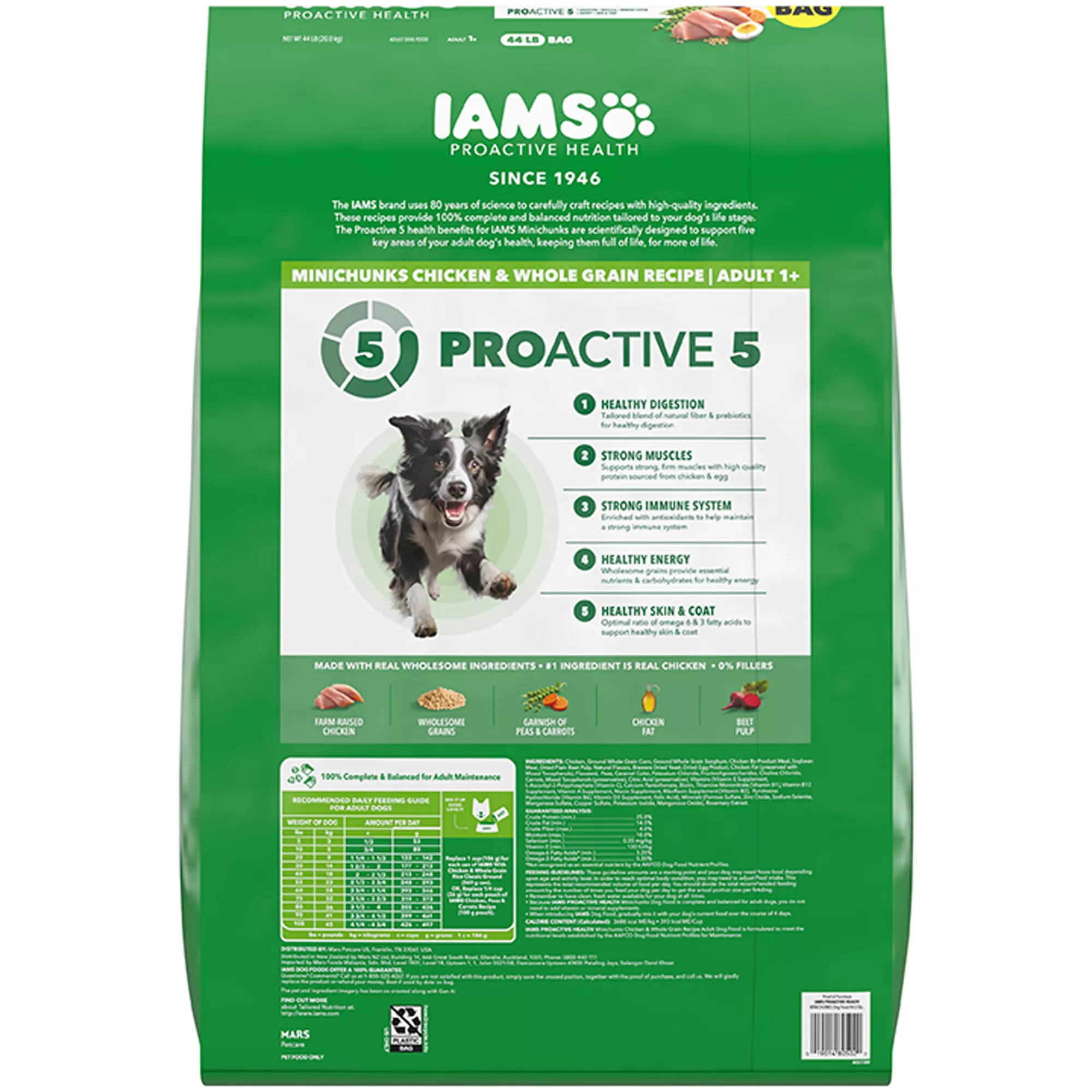 44 lb. Bag: Contains one 44 lb. bag of IAMS Proactive Health Adult Minichunks Dry Dog Food Chicken & Whole Grain Recipe.