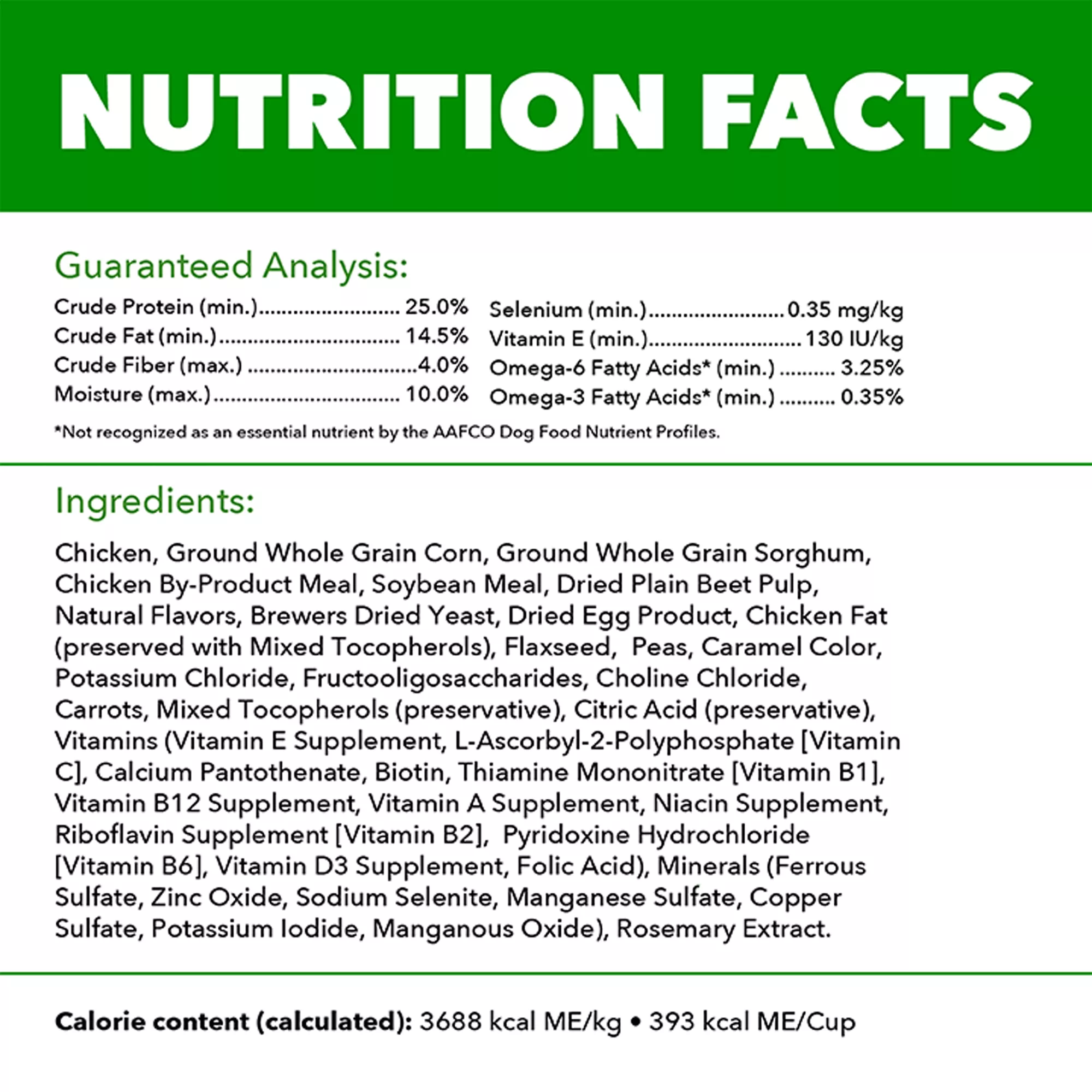 Ingredients: Chicken, Ground Whole Grain Corn, Ground Whole Grain Sorghum , Chicken By-Product Meal, Soybean Meal, Dried Plain Beet Pulp, Natural Flavors, Brewers Dried Yeast, Dried Egg Product, Chicken Fat (preserved with Mixed Tocopherols), Flaxseed, Peas, Caramel Color, Potassium Chloride, Fructooligosaccharides, Choline Chloride, Carrots, Mixed Tocopherols (preservative), Citric Acid (preservative), Vitamins (Vitamin E Supplement, L-Ascorbyl-2-Polyphosphate [Vitamin C], Calcium Pantothenate, Biotin, Thiamine Mononitrate [Vitamin B1], Vitamin B12 Supplement, Vitamin A Supplement, Niacin Supplement, Riboflavin Supplement [Vitamin B2], Pyridoxine Hydrochloride [Vitamin B6], Vitamin D3 Supplement, Folic Acid), Minerals (Ferrous Sulfate, Zinc Oxide, Sodium Selenite, Manganese Sulfate, Copper Sulfate, Potassium Iodide, Manganous Oxide), Rosemary Extract.