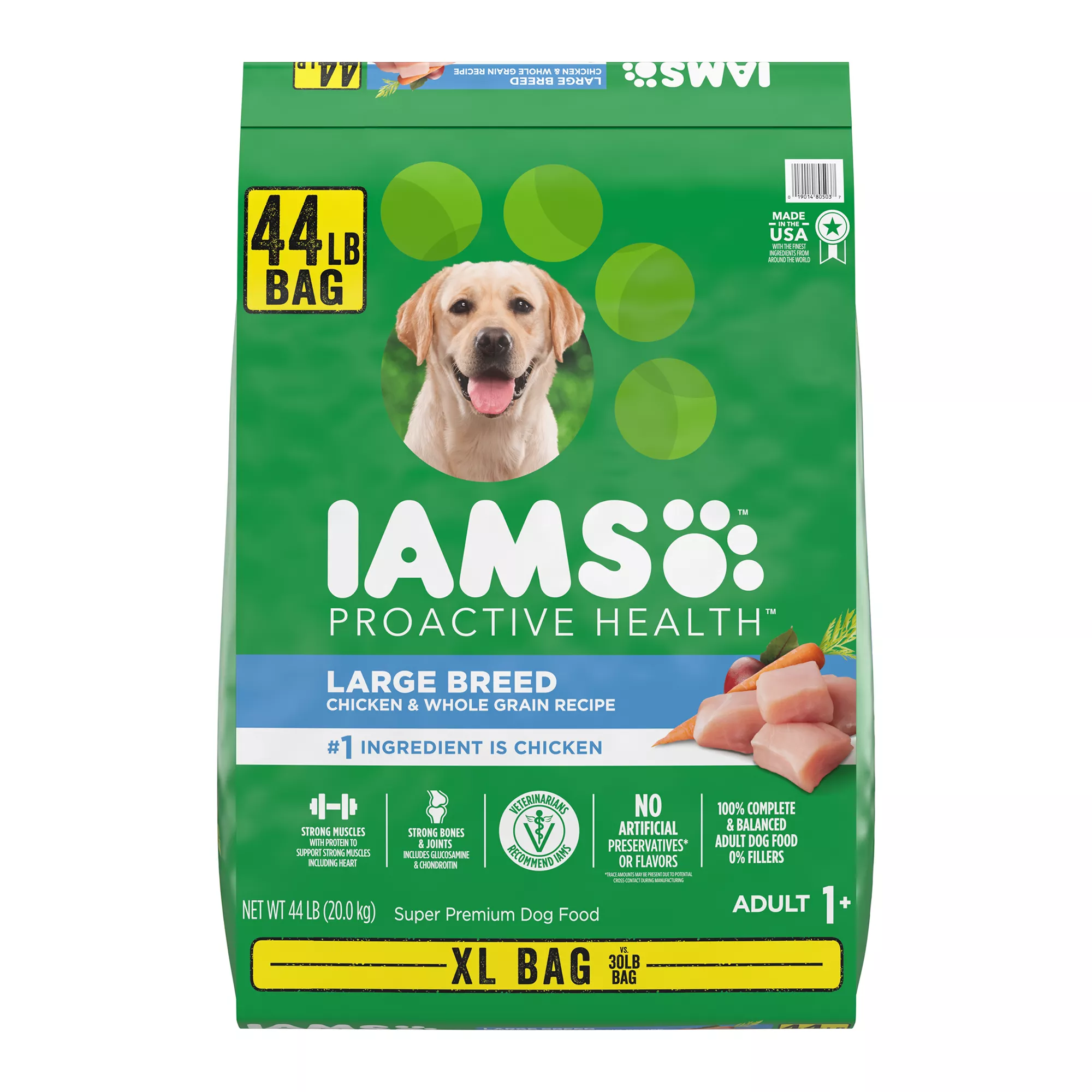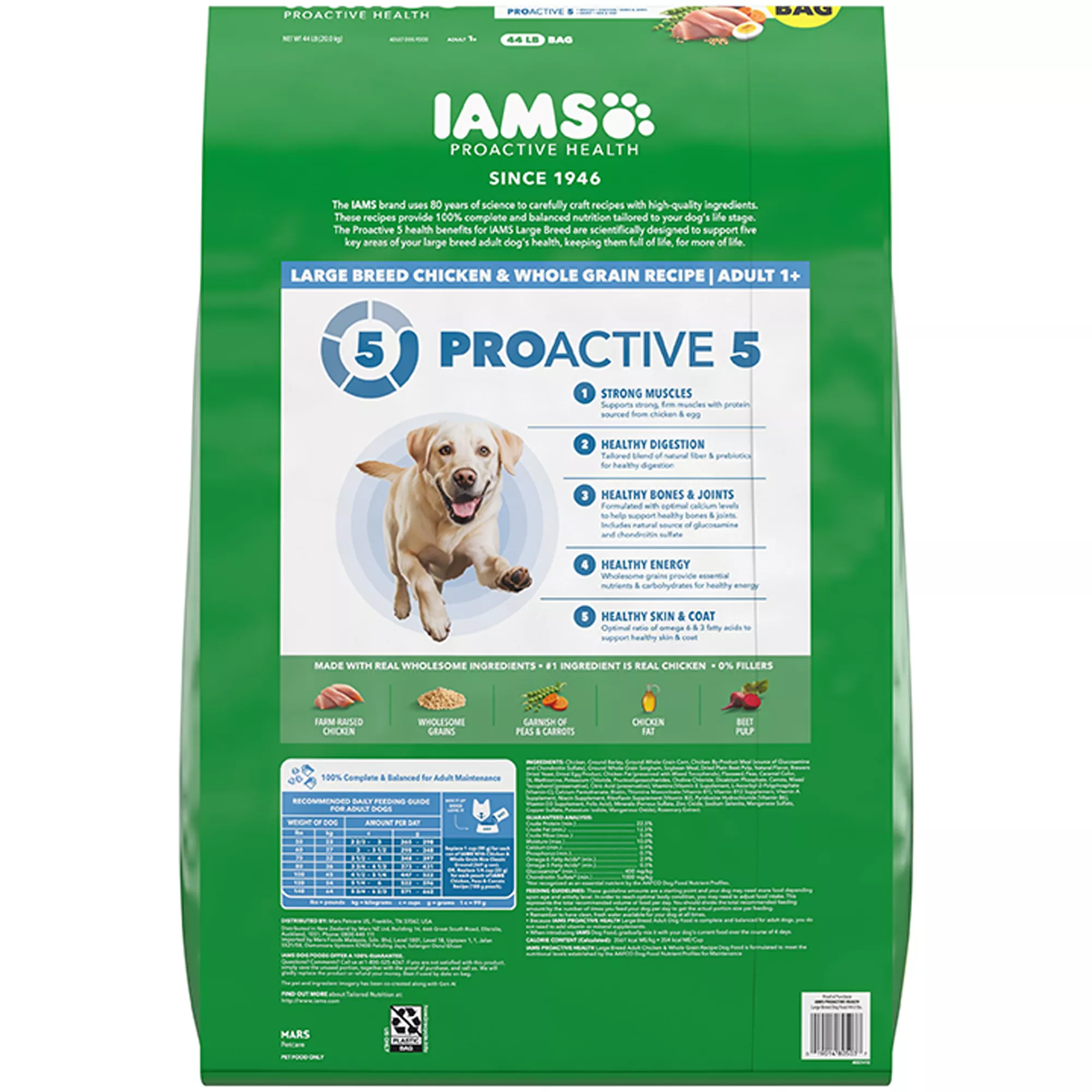 44 lb. Bag: Contains one (1) 44 lb. bag of IAMS Proactive Health Large Breed Adult Dry Dog Food Chicken & Whole Grain Recipe.