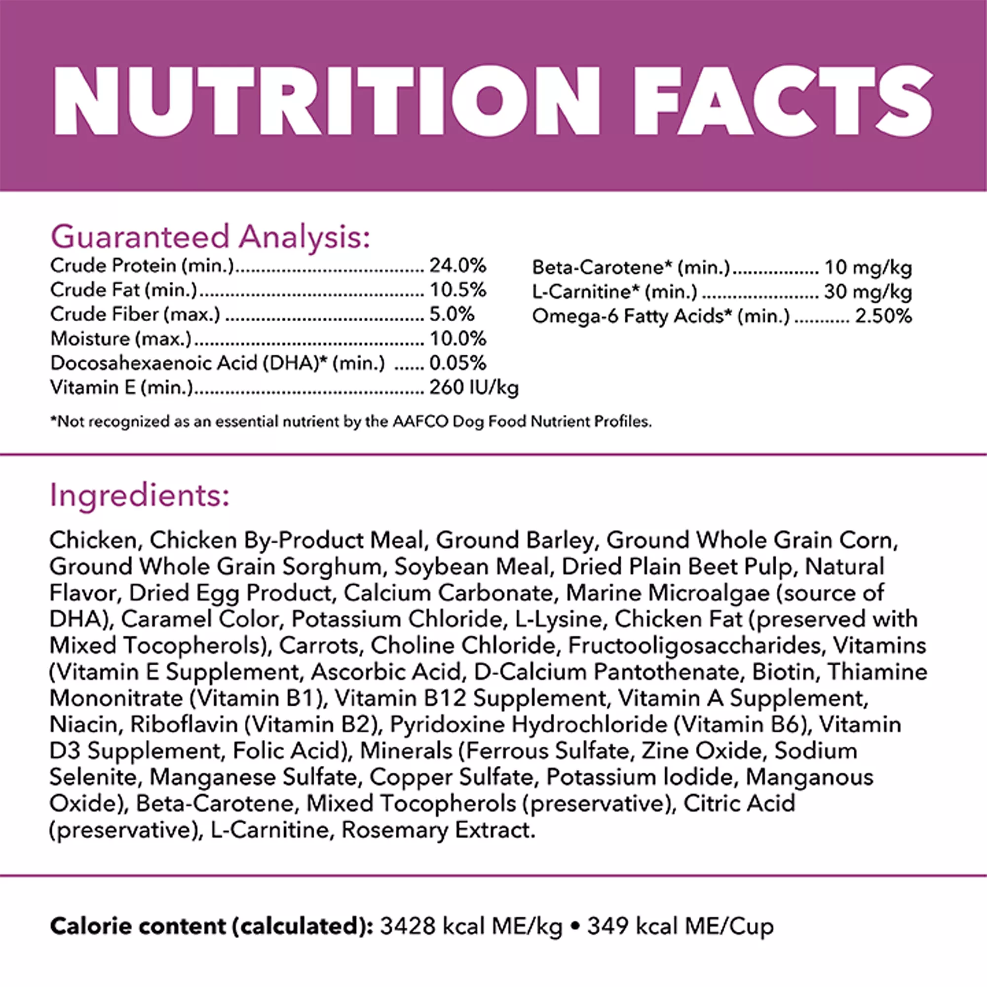 Ingredients: Chicken, Chicken By-Product Meal, Ground Barley, Ground Whole Grain Corn, Ground Whole Grain Sorghum, Soybean Meal, Dried Plain Beet Pulp, Natural Flavor, Dried Egg Product, Calcium Carbonate, Marine Microalgae (source of DHA), Caramel Color, Potassium Chloride, L-Lysine, Chicken Fat (preserved with Mixed Tocopherols), Carrots, Choline Chloride, Fructooligosaccharides, Vitamins (Vitamin E Supplement, Ascorbic Acid, D-Calcium Pantothenate, Biotin, Thiamine Mononitrate (Vitamin B1), Vitamin B12 Supplement, Vitamin A Supplement, Niacin, Riboflavin (Vitamin B2), Pyridoxine Hydrochloride (Vitamin B6), Vitamin D3 Supplement, Folic Acid), Minerals (Ferrous Sulfate, Zinc Oxide, Sodium Selenite, Manganese Sulfate, Copper Sulfate, Potassium Iodide, Manganous Oxide), Beta Carotene, Mixed Tocopherols (preservative), Citric Acid (preservative), L-Carnitine, Rosemary Extract.