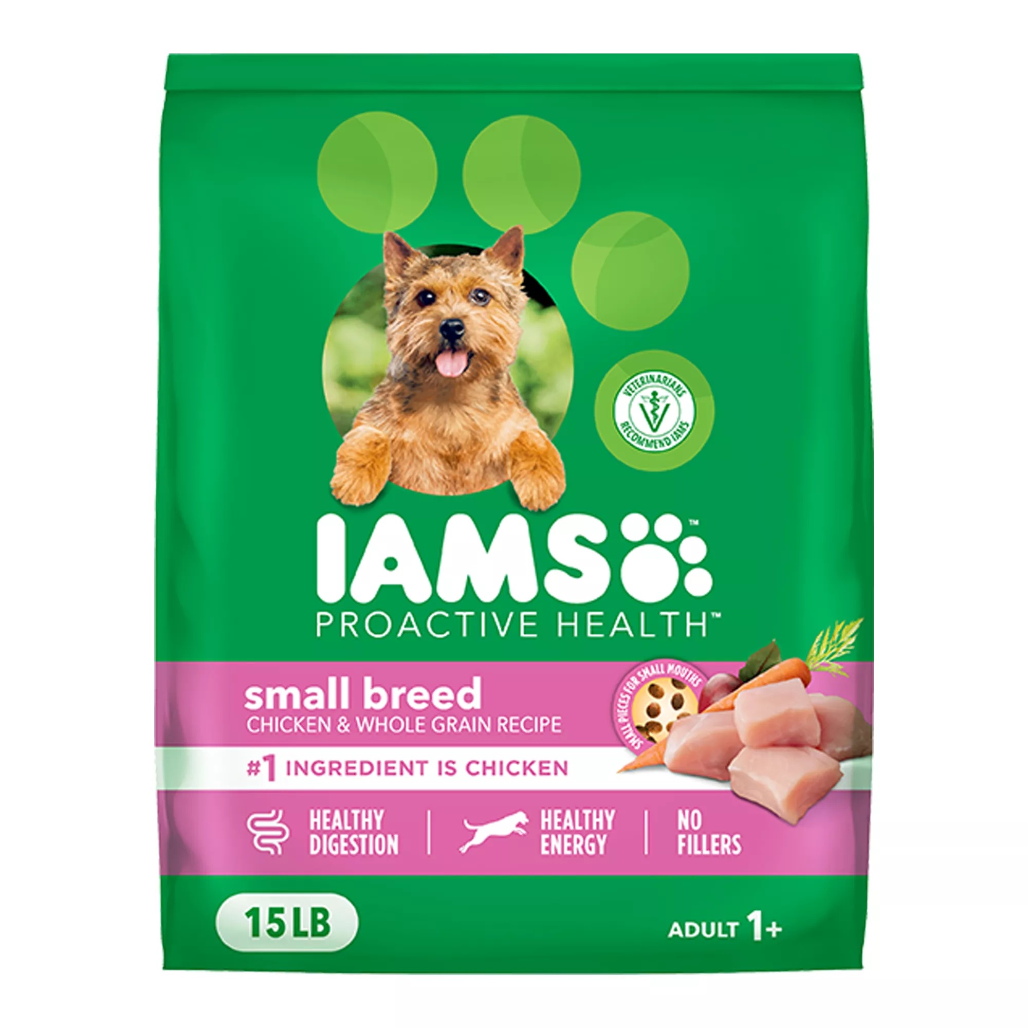 Veterinarians Recommend IAMS: This IAMS Proactive Health Small Breed Adult Recipe is made with real chicken as the #1 ingredient and contains no fillers or artificial flavors; ingredients are natural as defined by the Association of American Feed Control Officials (AAFCO).