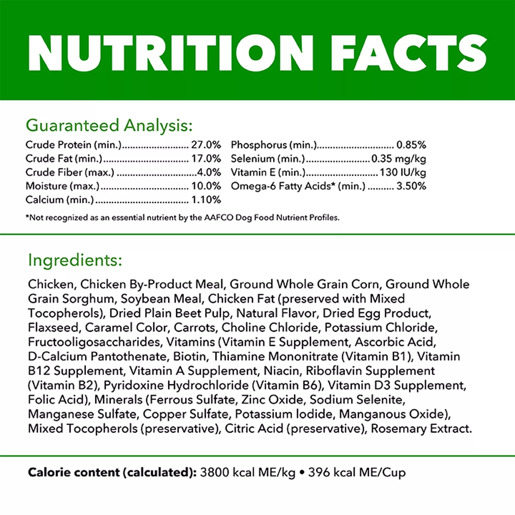 Ingredients: Chicken, Chicken By-Product Meal, Ground Whole Grain Corn, Ground Whole Grain Sorghum, Soybean Meal, Chicken Fat (preserved with Mixed Tocopherols), Dried Plain Beet Pulp, Natural Flavor, Dried Egg Product, Flaxseed, Caramel Color, Carrots, Choline Chloride, Potassium Chloride, Fructooligosaccharides, Vitamins (Vitamin E Supplement, Ascorbic Acid, D-Calcium Pantothenate, Biotin, Thiamine Mononitrate (Vitamin B1), Vitamin B12 Supplement, Vitamin A Supplement, Niacin, Riboflavin Supplement (Vitamin B2), Pyridoxine Hydrochloride (Vitamin B6), Vitamin D3 Supplement, Folic Acid), Minerals (Ferrous Sulfate, Zinc Oxide, Sodium Selenite, Manganese Sulfate, Copper Sulfate, Potassium Iodide, Manganous Oxide), Mixed Tocopherols (preservative), Citric Acid (preservative), Rosemary Extract.