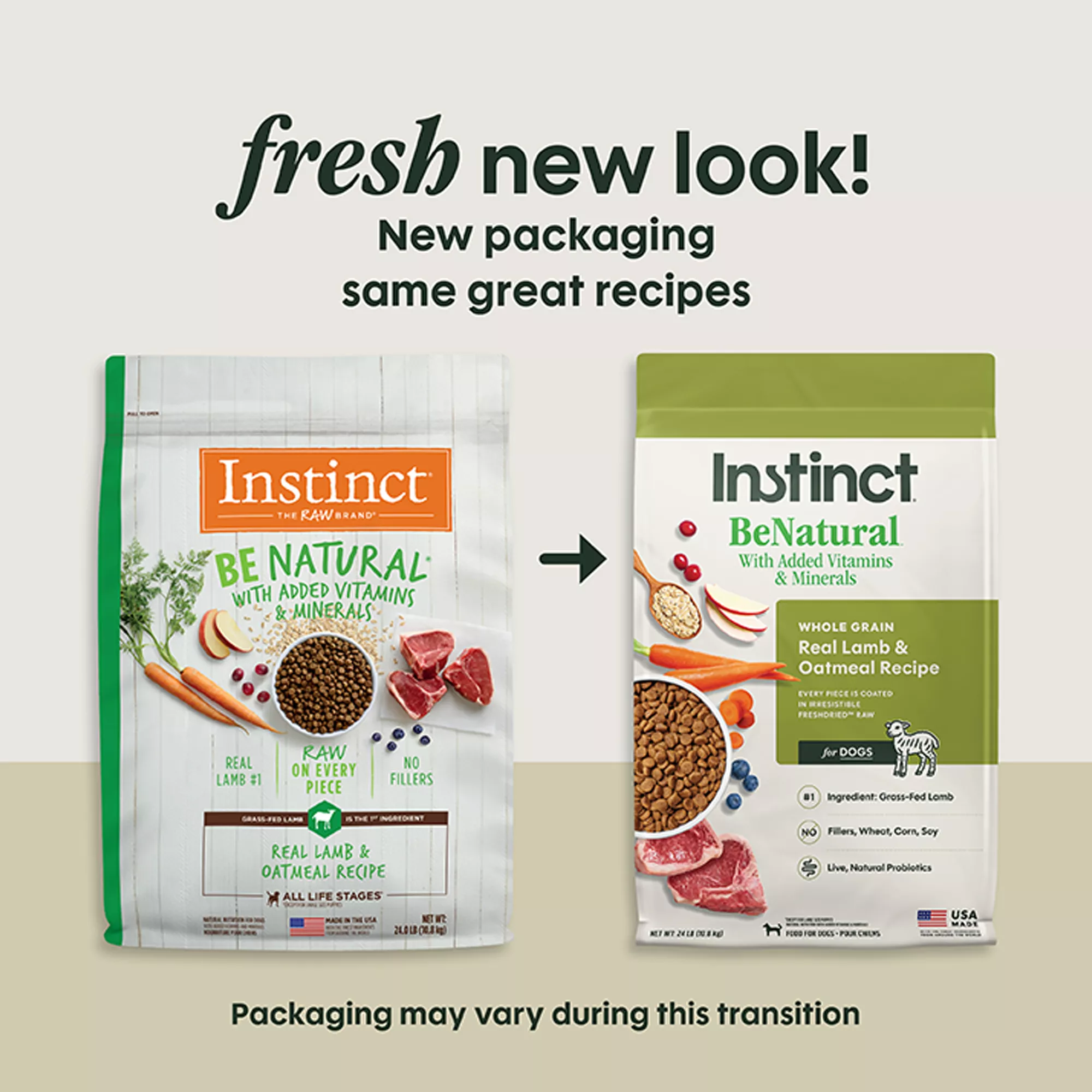 Instinct Be Natural Real Lamb & Oatmeal Recipe starts with grass-fed lamb and never contains filler, corn, wheat, soy or by-product meals or artificial preservatives and colors. Guided by our belief in the power of raw, each piece is tumbled with crushed freeze-dried raw lamb – raising the bar in nutrition and taste. Instinct Be Natural Real Lamb & Oatmeal is formulated to meet the nutritional levels established by the AAFCO Dog Food Nutrient Profiles for all life stages except for growth of large size dogs (70 lbs or more as an adult). Warranty Statement: All Instinct products are 100% Satisfaction Guaranteed. If you or your pet are not completely satisfied with this or any Instinct product, simply return the unused portion, along with the original sales receipt, to the retailer for a complete refund or replacement.