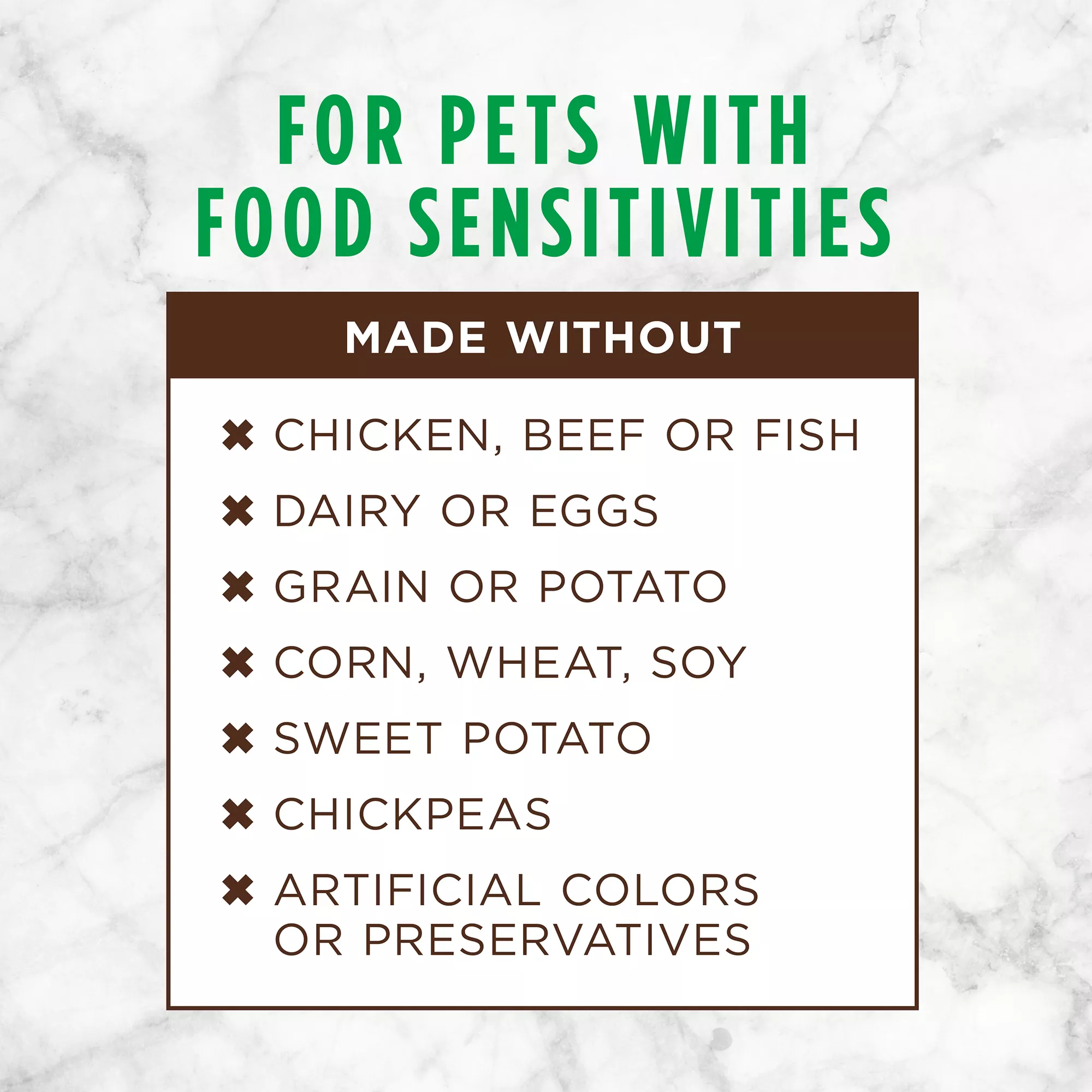 Made without – grain, dairy, eggs, chicken, beef, fish, sweet potato, potato, chickpeas, corn, wheat, soy, artificial colors or preservatives