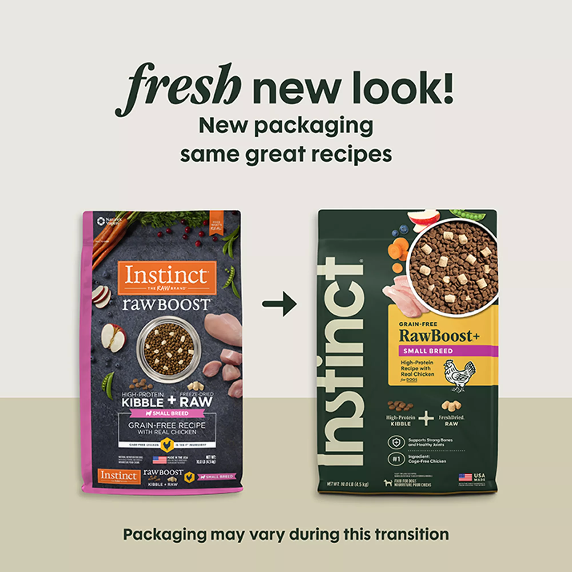 Instinct Raw Boost Small Breed Chicken Dry Dog Food, 10 lb. Bag – High animal-protein, grain-free, boosted nutrition with bites of freeze-dried raw meat, made especially for your small breed, Instinct Raw Boost Grain-Free Recipe with Real Chicken for Small Breed Dogs is a better way to feed kibble. Unlock your dog’s potential to thrive and put more of the pure, real nutrition of raw into every bowl. Available Varieties: Small Breed, Gut Health. Complete and Balanced Statement: Instinct Raw Boost Grain-Free Recipe with Real Chicken for Small Breed Dogs is formulated to meet the nutritional levels established by the AAFCO Dog Food Nutrient Profiles for all life stages except for growth of large size dogs (70 lbs or more as an adult). Warranty Statement: All Instinct products are 100% Satisfaction Guaranteed. If you or your pet are not completely satisfied with this or any Instinct product, simply return the unused portion, along with the original sales receipt,to the retailer for a complete refund or replacement. Contact Us: 1-888-519-7387.
