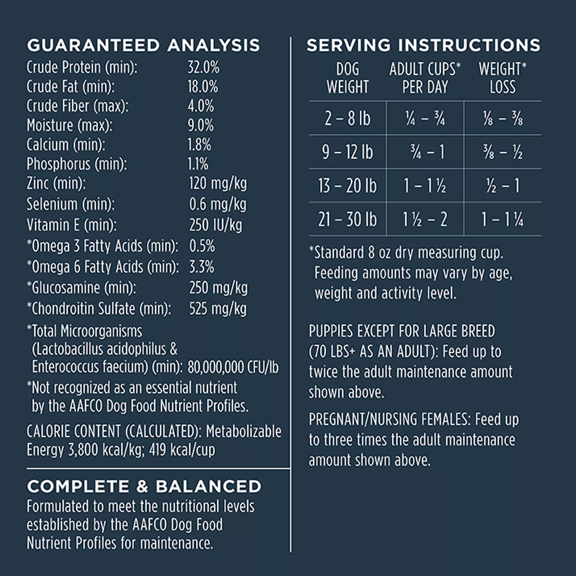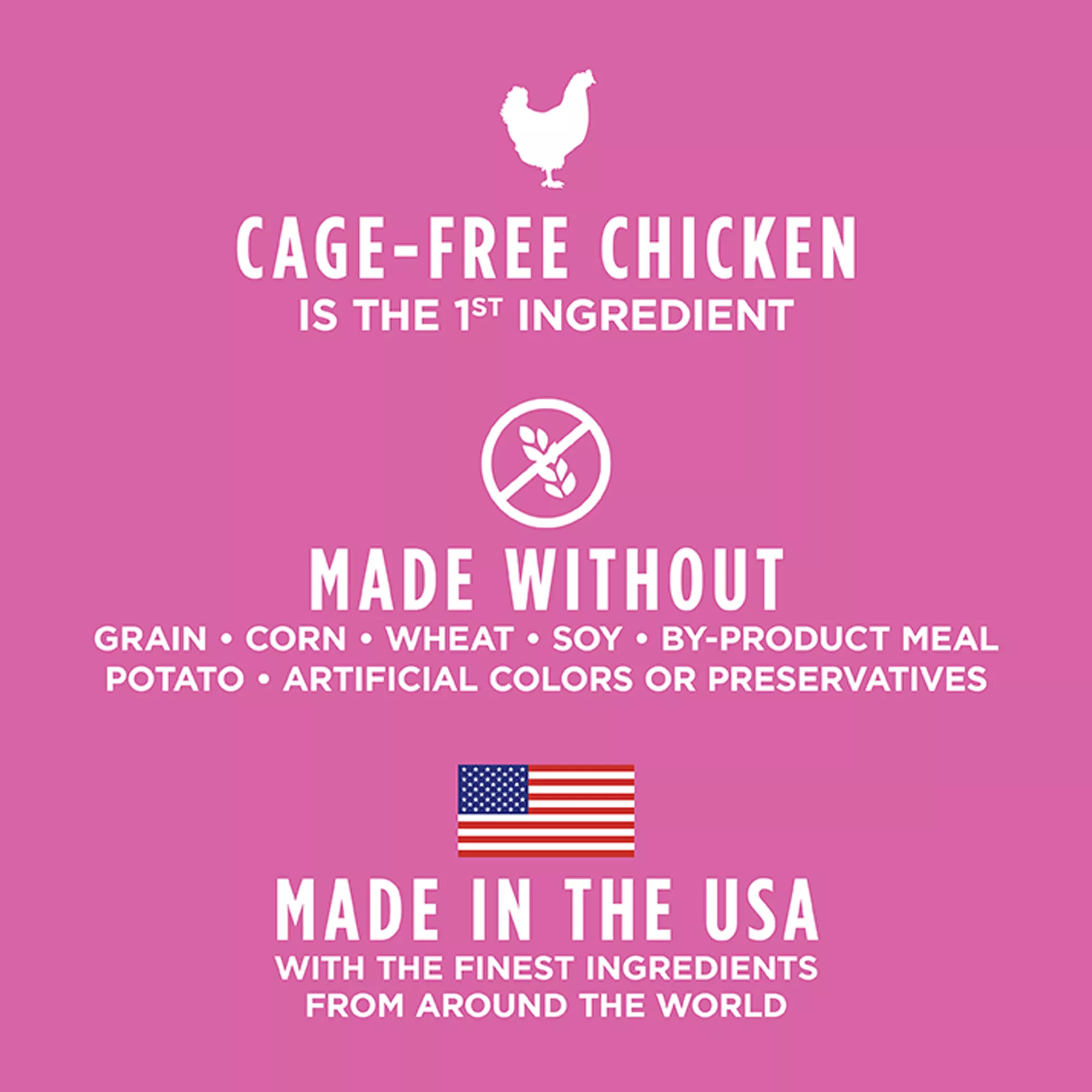Cage-free chicken is the first ingredient – protein packed for strong, lean muscles; ideal balance of protein, fat & calories for healthy body weight