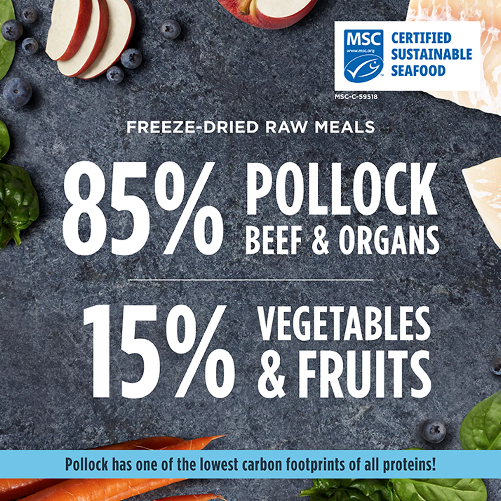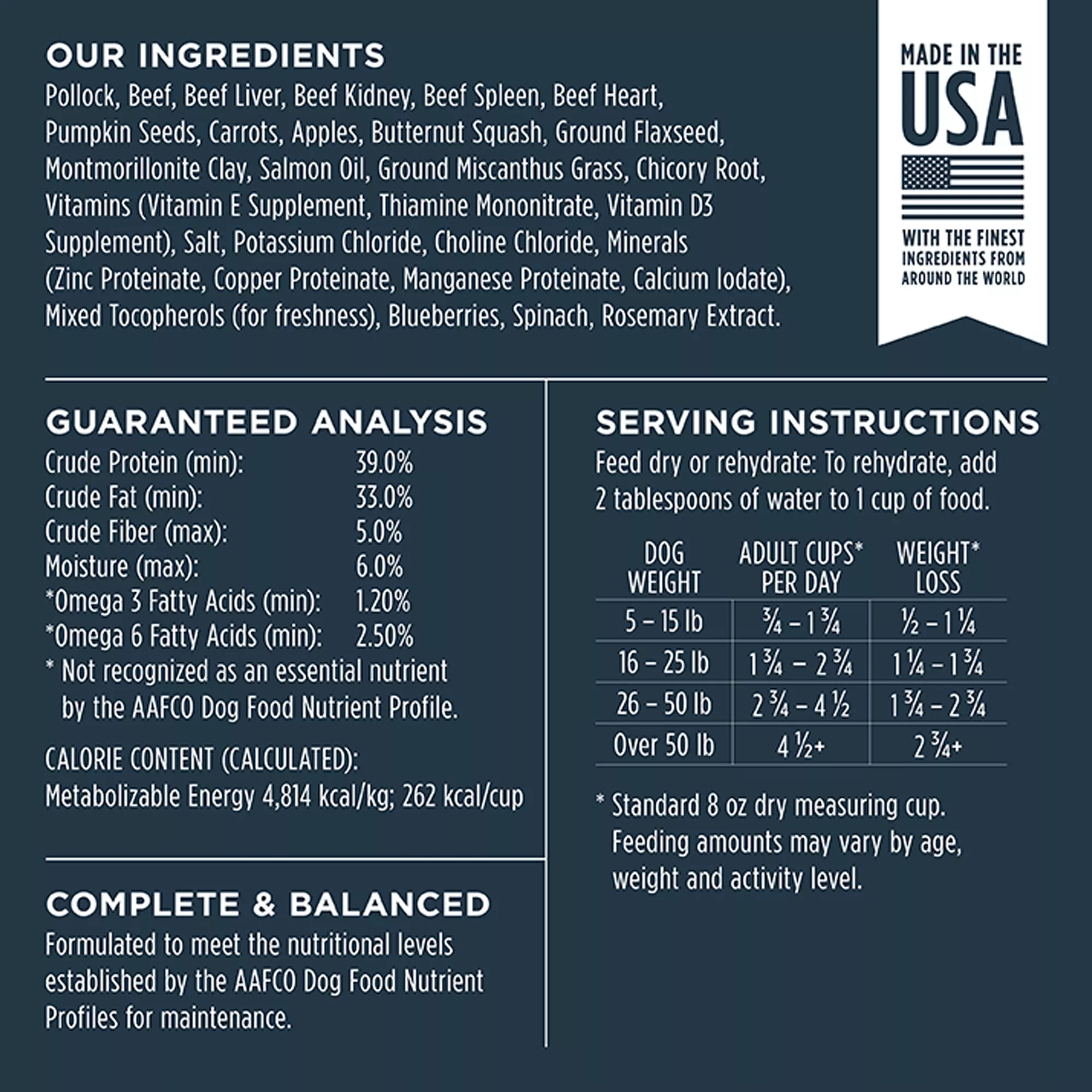 Upgrade your dog’s bowl from kibble to freeze-dried raw. Each Instinct Raw Freeze-Dried Meals recipe is protein packed with 85% fish, meat & organs and 15% non-GMO fruits, vegetables; vitamins & minerals. Made without grain, corn, wheat, soy, legumes, artificial colors or preservatives. Instinct Raw Freeze-Dried Meals Wild-Caught Alaskan Pollock Recipe is formulated to meet the nutritional levels established by the AAFCO Dog Food Nutrient Profiles for maintenance. All Instinct products are 100% Satisfaction Guaranteed. If you or your pet are not completely satisfied with this or any Instinct product, simply return the unused portion, along with the original sales receipt, to the retailer for a complete refund or replacement.