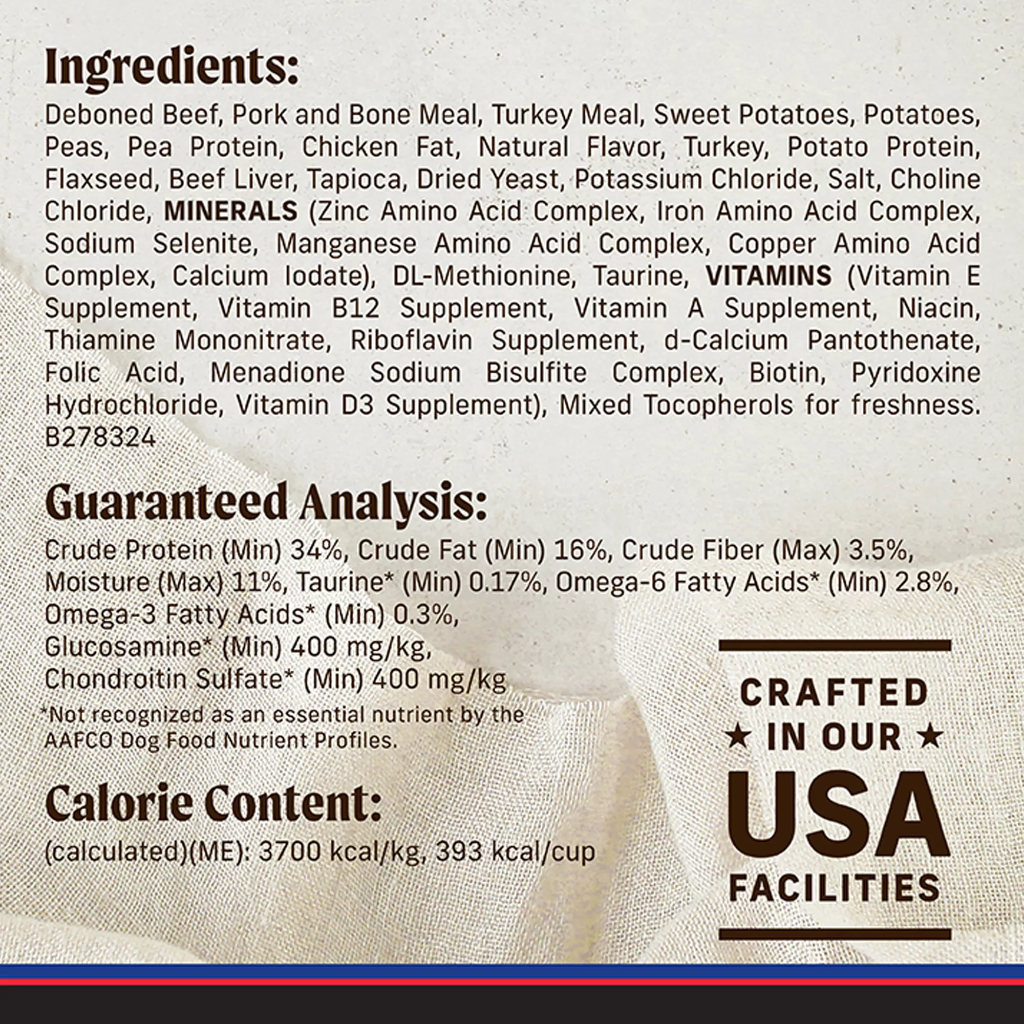 Ingredients: Deboned Beef, Pork and Bone Meal, Turkey Meal, Sweet Potatoes, Potatoes, Peas, Pea Protein, Chicken Fat, Natural Flavor, Turkey, Potato Protein, Flaxseed, Beef Liver, Tapioca, Dried Yeast, Potassium Chloride, Salt, Choline Chloride, MINERALS (Zinc Amino Acid Complex, Iron Amino Acid Complex, Sodium Selenite, Manganese Amino Acid Complex, Copper Amino Acid Complex,Calcium Iodate),
